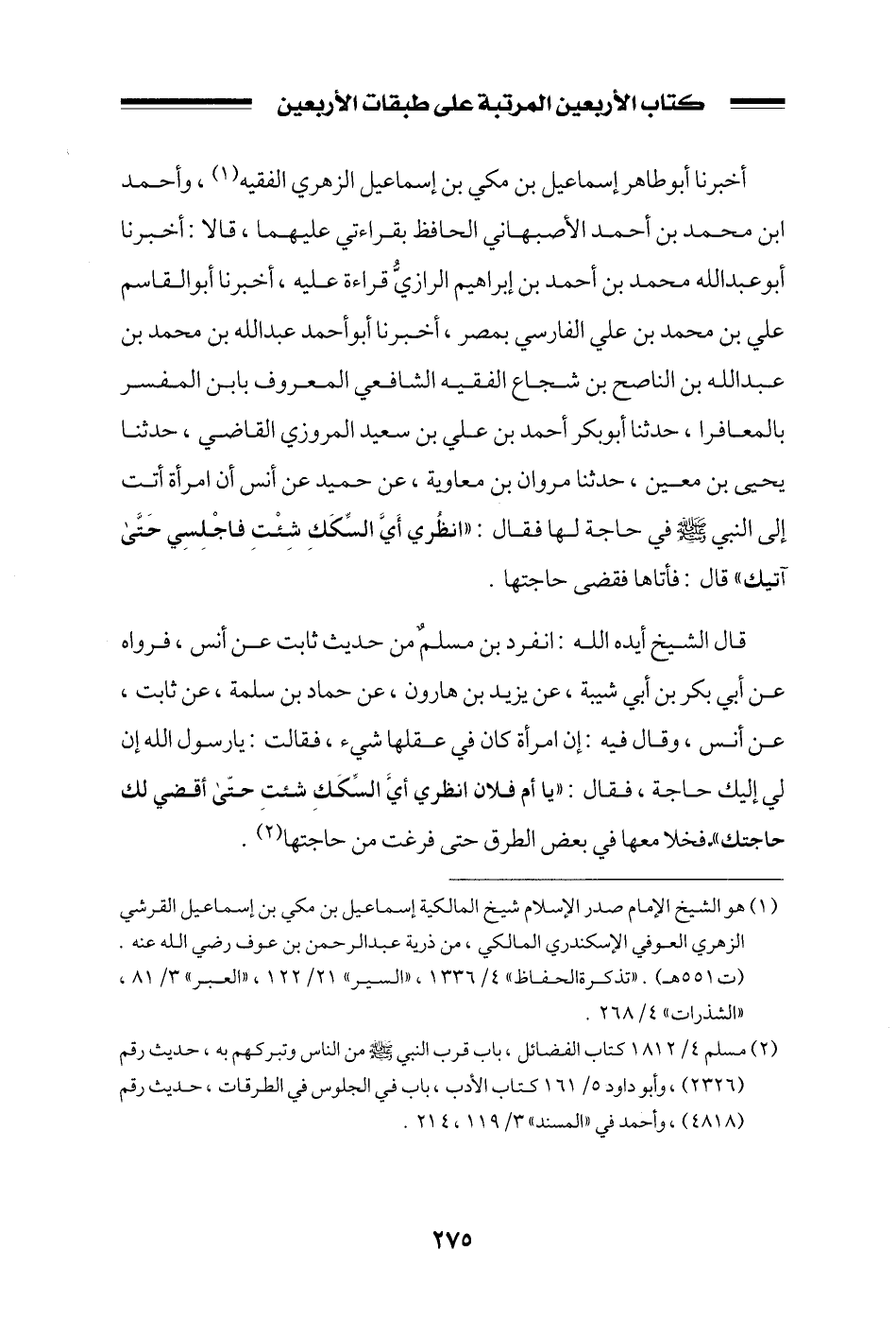 أخبرنا أبو طاهر إسماعيل بن مكي بن إسماعيل الزهري الفقيه، وأحمد ابن محمد بن أحمد الأصبهاني الحافظ بقراءتي عليهما، قالا: أخبرنا أبو عبد الله محمد بن أحمد بن إبراهيم الرازي قراءة عليه، أخبرنا أبو القاسم علي بن محمد بن علي الفارسي بمصر، أخبرنا أبو أحمد عبد الله بن محمد بن عبد الله بن الناصح بن شجاع الفقيه الشافعي المعروف بابن المفسر بالمعافرا، حدثنا أبو بكر أحمد بن علي بن سعيد المروزي القاضي، حدثنا يحيى بن معين، حدثنا مروان بن معاوية، عن حميد عن أنس أن امرأة أتت إلى النبي صلى الله عليه وسلم في حاجة لها فقال: ((انظري أي السكك شئت فاجلسي حتى آتيك)) قال: فأتاها فقضى حاجتها.