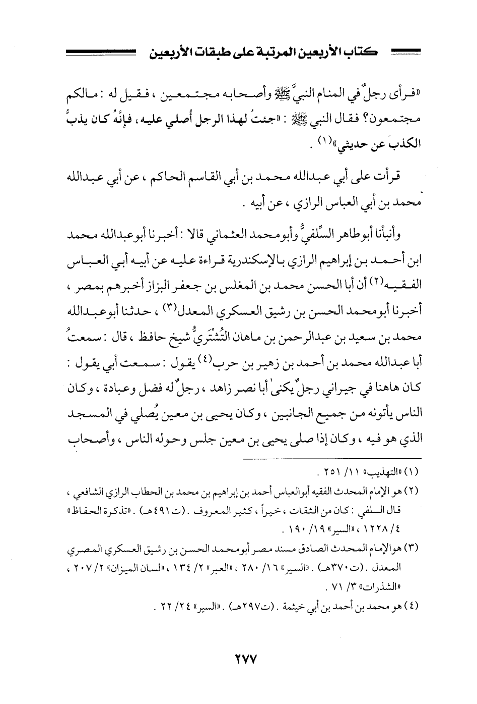 ((فرأى رجلٌ في المنام النبي صلى الله عليه وسلم وأصحابه مجتمعين، فقيل له: ما لكم مجتمعون؟ فقال النبي صلى الله عليه وسلم: ((جئت لهذا الرجل أصلي عليه، فإنه كان يذب الكذب عن حديثي)) .