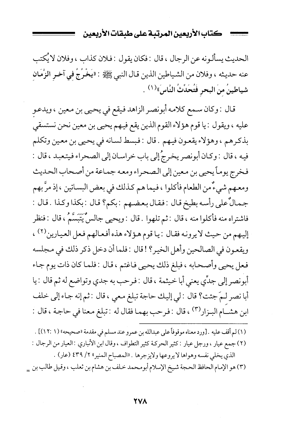 قال: وكان سمع كلامه أبو نصر الزاهد فيقع في يحيى بن معين، ويدعو عليه، ويقول: يا قوم هؤلاء القوم الذين يقع فيهم يحيى بن معين نحن نستسقي بذكرهم، وهؤلاء يقعون فيهم. قال: فبسط لسانه في يحيى بن معين وتكلم فيه، قال: وكان أبو نصر يخرج إلى باب خراسان إلى الصحراء فيتعبد، قال: فخرج يوماً يحيى بن معين إلى الصحراء ومعه جماعة من أصحاب الحديث ومعهم شيءٌ من الطعام فأكلوا، فيما هم كذلك في بعض البساتين، إذ مر بهم جمالٌ على رأسه بطيخ قال: فقال بعضهم: بكم؟ قال: بكذا وكذا. قال: فاشتراه منه فأكلوا منه، قال: ثم تلهوا. قال: ويحيى جالسٌ يتبسم، قال: فنظر إليهم من حيث لا يرونه فقال: يا قوم هؤلاء هذه أفعالهم فعل العيارين، ويقعون في الصالحين وأهل الخير؟! قال: فلما أن دخل ذكر ذلك في مجلسه فعل يحيى وأصحابه، فبلغ ذلك يحيى فاغتم، قال: فلما كان ذات يوم جاء أبو نصر إلى جدي يعني أبا خيثمة، قال: فرحب به جدي وتواضع له ثم قال: يا أبا نصر لم جئت؟ قال: لي إليك حاجة تبلغ معي، قال: ثم إنه جاء إلى خلف ابن هشام البزار، قال: فرحب بهما فقال له: تبلغ معنا في حاجة، قال: