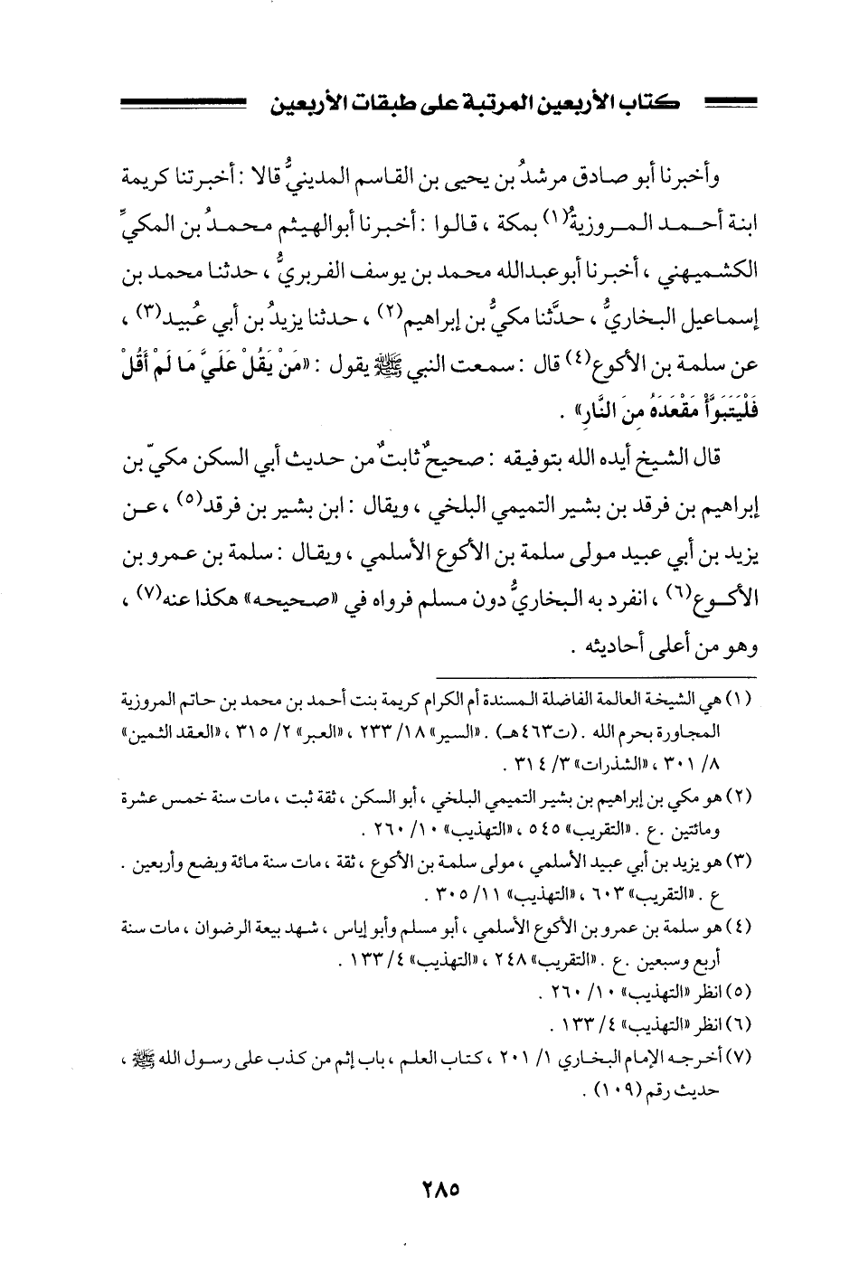 وأخبرنا أبو صادق مرشد بن يحيى بن القاسم المديني قالا: أخبرتنا كريمة ابنة أحمد المروزية بمكة، قالوا: أخبرنا أبو الهيثم محمد بن المكي الكشميهني، أخبرنا أبو عبد الله محمد بن يوسف الفربري، حدثنا محمد بن إسماعيل البخاري، حدثنا مكي بن إبراهيم، حدثنا يزيد بن أبي عبيد، عن سلمة بن الأكوع قال: سمعت النبي صلى الله عليه وسلم يقول: ((من يقل علي ما لم أقل فليتبوأ مقعده من النار)) .