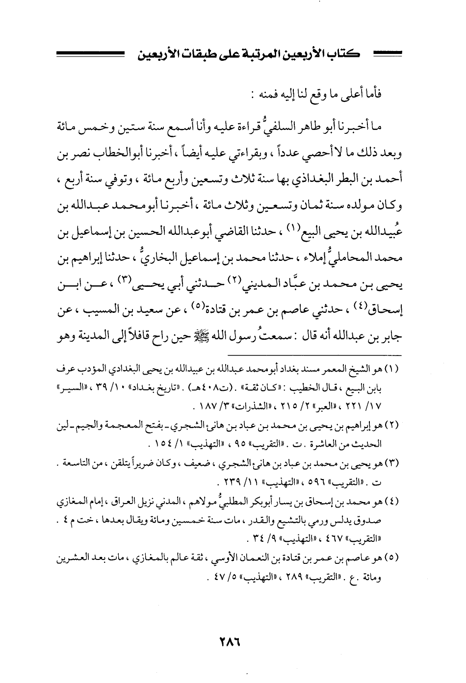 ما أخبرنا أبو طاهر السلفي قراءة عليه وأنا أسمع سنة ستين وخمس مائة وبعد ذلك ما لا أحصي عدداً، وبقراءتي عليه أيضاً، أخبرنا أبو الخطاب نصر بن أحمد بن البطر البغداذي بها سنة ثلاث وتسعين وأربع مائة، وتوفي سنة أربع، وكان مولده سنة ثمان وتسعين وثلاث مائة، أخبرنا أبو محمد عبد الله بن عبيد الله بن يحيى البيع، حدثنا القاضي أبو عبد الله الحسين بن إسماعيل بن محمد المحاملي إملاء، حدثنا محمد بن إسماعيل البخاري، حدثنا إبراهيم بن يحيى بن محمد بن عباد المديني حدثني أبي يحيى، عن ابن إسحاق، حدثني عاصم بن عمر بن قتادة، عن سعيد بن المسيب، عن جابر بن عبد الله أنه قال: سمعت رسول الله صلى الله عليه وسلم حين راح قافلاً إلى المدينة وهو