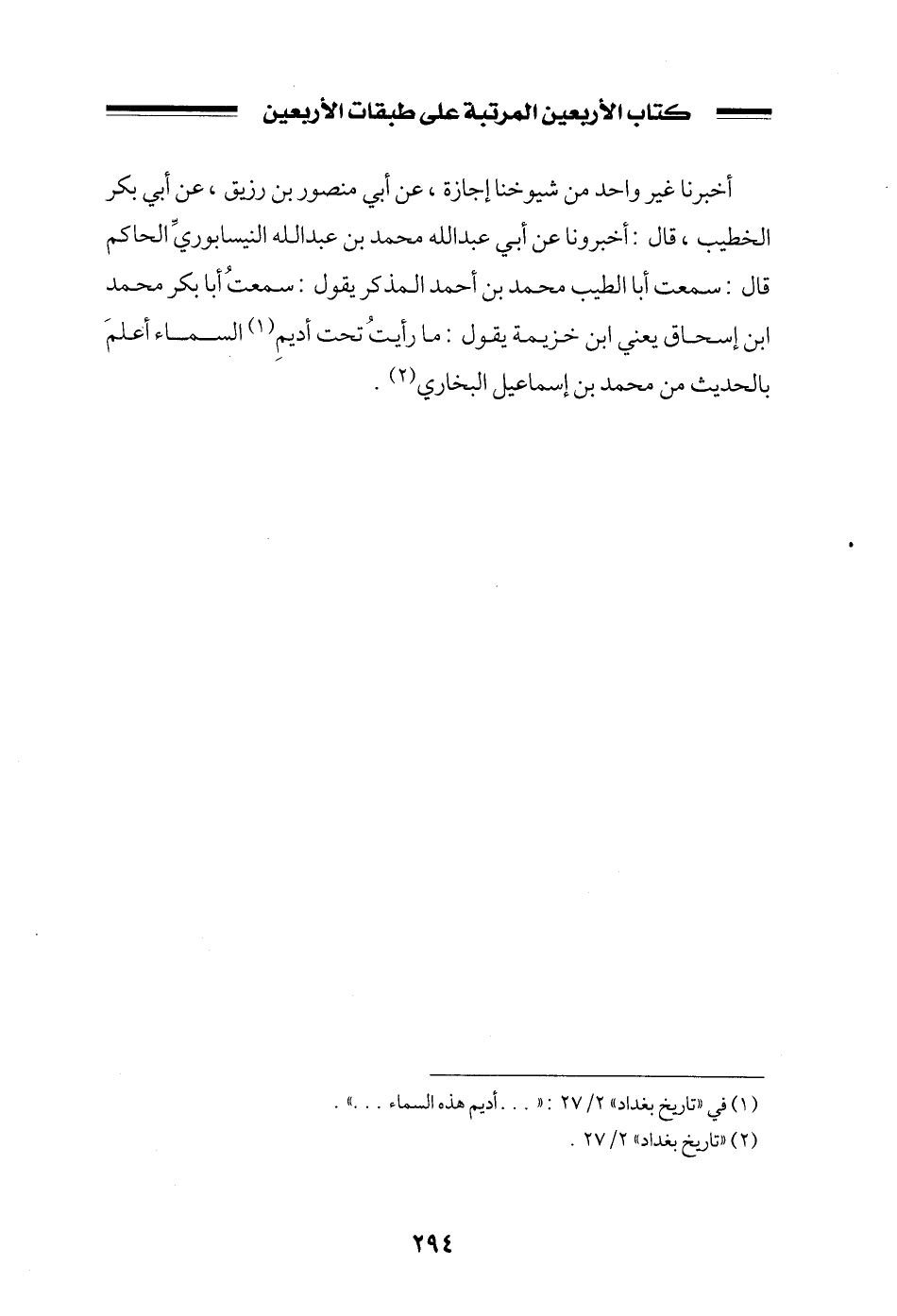 أخبرنا غير واحد من شيوخنا إجازة، عن أبي منصور بن رزيق، عن أبي بكر الخطيب، قال: أخبرونا عن أبي عبد الله محمد بن عبد الله النيسابوري الحاكم قال: سمعت أبا الطيب محمد بن أحمد المذكر يقول: سمعت أبا بكر محمد ابن إسحاق يعني ابن خزيمة يقول: ما رأيت تحت أديم السماء أعلم بالحديث من محمد بن إسماعيل البخاري.