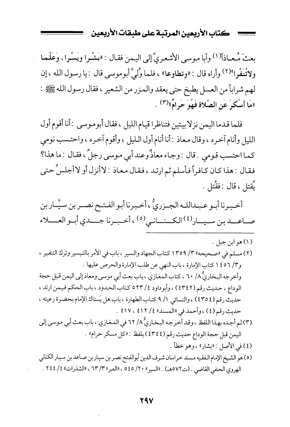 بعث معاذاً وأبا موسى الأشعري إلى اليمن فقال: ((بشرا ويسرا، وعلما ولا تنفرا)) وأراه قال: ((وتطاوعا)) ، فلما ولي أبو موسى قال: يا رسول الله، إن لهم شراباً من العسل يطبخ حتى يعقد والمزر من الشعير، فقال رسول الله صلى الله عليه وسلم: ((ما أسكر عن الصلاة فهو حرامٌ)) .