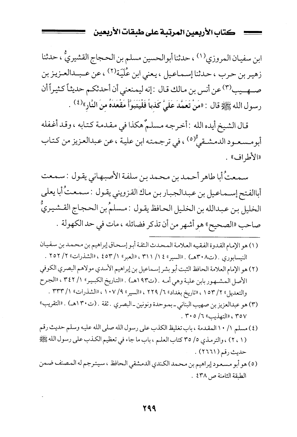 ابن سفيان المروزي، حدثنا أبو الحسين مسلم بن الحجاج القشيري، حدثنا زهير بن حرب، حدثنا إسماعيل، يعني ابن علية، عن عبد العزيز بن صهيب عن أنس بن مالك قال: إنه ليمنعني أن أحدثكم حديثاً كثيراً أن رسول الله صلى الله عليه وسلم قال: ((من تعمد علي كذباً فليتبوأ مقعده من النار)) .