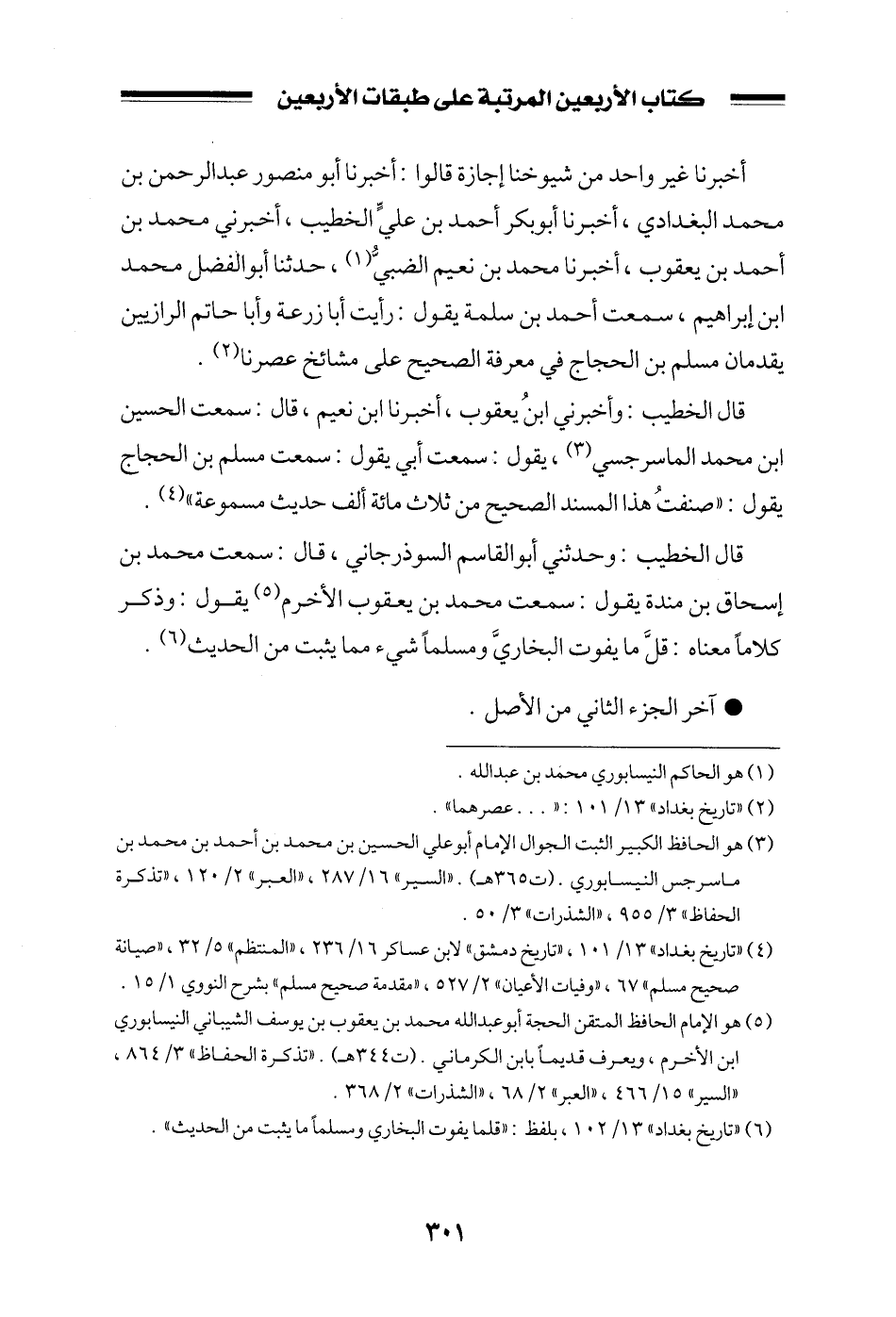 أخبرنا غير واحد من شيوخنا إجازة قالوا: أخبرنا أبو منصور عبد الرحمن بن محمد البغدادي، أخبرنا أبو بكر أحمد بن علي الخطيب، أخبرني محمد بن أحمد بن يعقوب، أخبرنا محمد بن نعيم الضبي، حدثنا أبو الفضل محمد ابن إبراهيم، سمعت أحمد بن سلمة يقول: رأيت أبا زرعة وأبا حاتم الرازيين يقدمان مسلم بن الحجاج في معرفة الصحيح على مشائخ عصرنا.