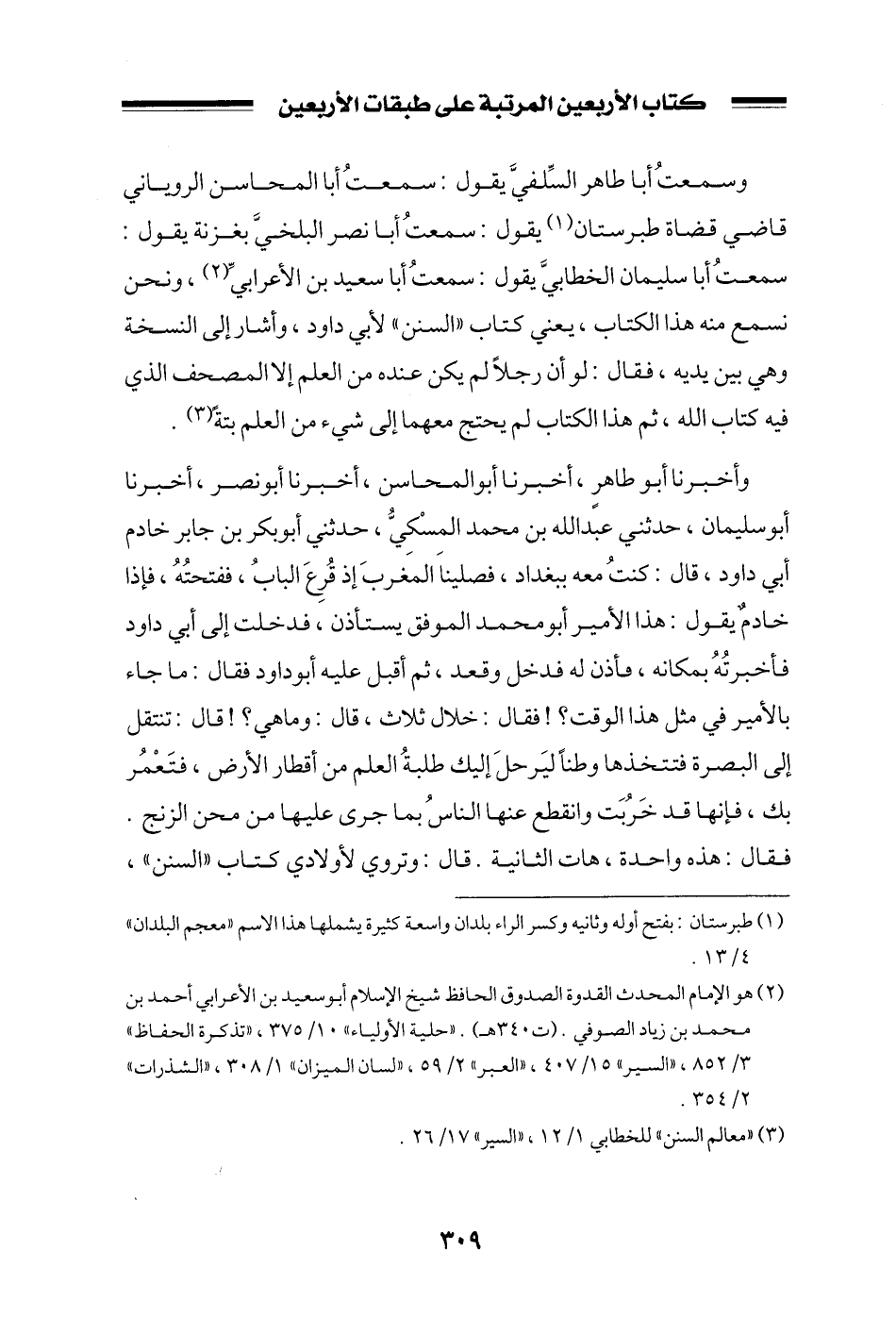 وسمعت أبا طاهر السلفي يقول: سمعت أبا المحاسن الروياني قاضي قضاة طبرستان يقول: سمعت أبا نصر البلخي بغزنة يقول: سمعت أبا سليمان الخطابي يقول: سمعت أبا سعيد بن الأعرابي، ونحن نسمع منه هذا الكتاب، يعني كتاب ((السنن)) لأبي داود، وأشار إلى النسخة وهي بين يديه، فقال: لو أن رجلاً لم يكن عنده من العلم إلا المصحف الذي فيه كتاب الله، ثم هذا الكتاب لم يحتج معهما إلى شيء من العلم بتةً.