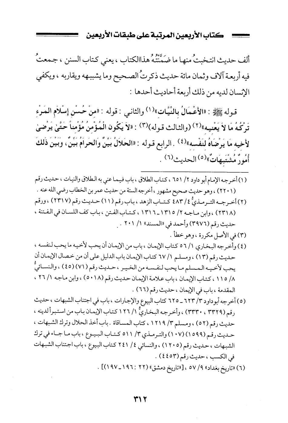 قوله صلى الله عليه وسلم: ((الأعمال بالنيات)) والثاني: قوله: ((من حسن إسلام المرء تركه ما لا يعنيه)) (والثالث قوله) : ((لا يكون المؤمن مؤمناً حتى يرضى لأخيه ما يرضاه لنفسه)) . الرابع قوله: ((الحلال بينٌ والحرام بينٌ، وبين ذلك أمورٌ مشتبهاتٌ)) الحديث.