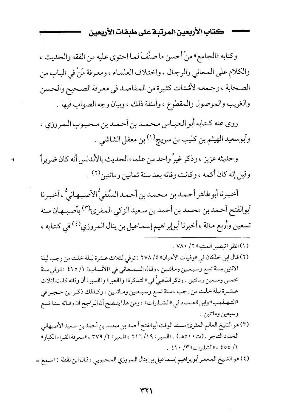 أخبرنا أبو طاهر أحمد بن محمد بن أحمد السلفي الأصبهاني، أخبرنا أبو الفتح أحمد بن محمد بن أحمد بن سعيد الزكي المقرئ بأصبهان سنة تسعين وأربع مائة، أخبرنا أبو إبراهيم إسماعيل بن ينال المروزي في كتابه،