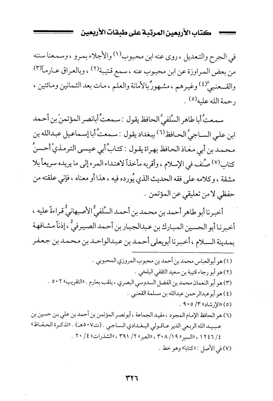 سمعت أبا طاهر السلفي الحافظ يقول: سمعت أبا نصر المؤتمن بن أحمد ابن علي الساجي الحافظ ببغداد يقول: سمعت أبا إسماعيل عبد الله بن محمد بن أبي معاذ الحافظ بهراة يقول: كتاب أبي عيسى الترمذي أحسن كتاب صنف في الإسلام، وأقربه مأخذاً لاهتداء المرء إلى ما يريده سريعاً بلا مشقة، وكلامه على فقه الحديث الذي يورده فيه، هذا أو معناه، فإني علقته من حفظي لا من تعليقي عن المؤتمن.