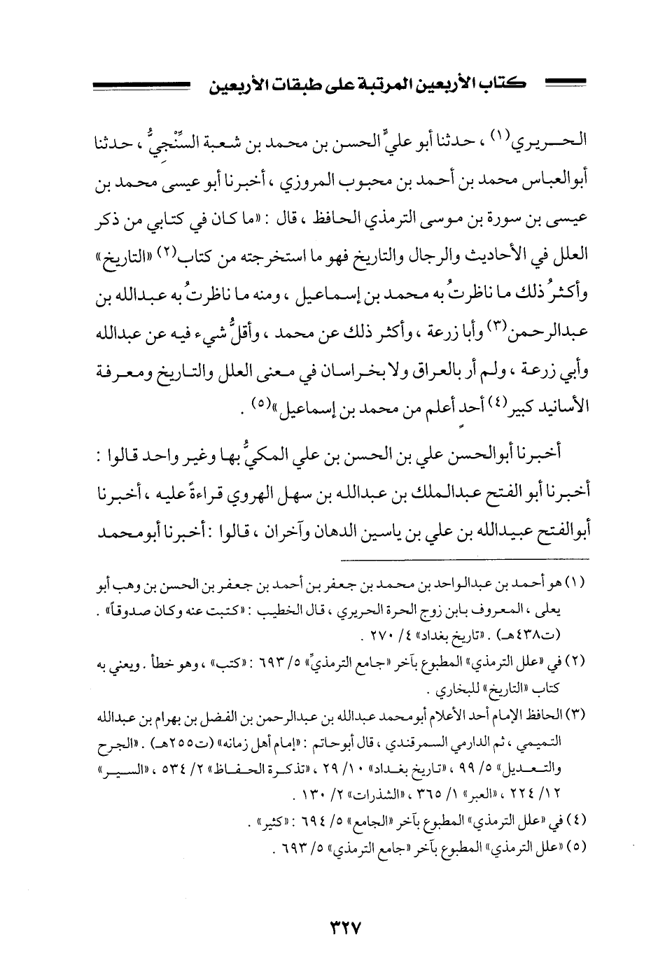 الحريري، حدثنا أبو علي الحسن بن محمد بن شعبة السنجي، حدثنا أبو العباس محمد بن أحمد بن محبوب المروزي، أخبرنا أبو عيسى محمد بن عيسى بن سورة بن موسى الترمذي الحافظ، قال: ((ما كان في كتابي من ذكر العلل في الأحاديث والرجال والتاريخ فهو ما استخرجته من كتاب ((التاريخ)) وأكثر ذلك ما ناظرت به محمد بن إسماعيل، ومنه ما ناظرت به عبد الله بن عبد الرحمن وأبا زرعة، وأكثر ذلك عن محمد، وأقل شيء فيه عن عبد الله وأبي زرعة، ولم أر بالعراق ولا بخراسان في معنى العلل والتاريخ ومعرفة الأسانيد كبير أحدٍ أعلم من محمد بن إسماعيل)) .