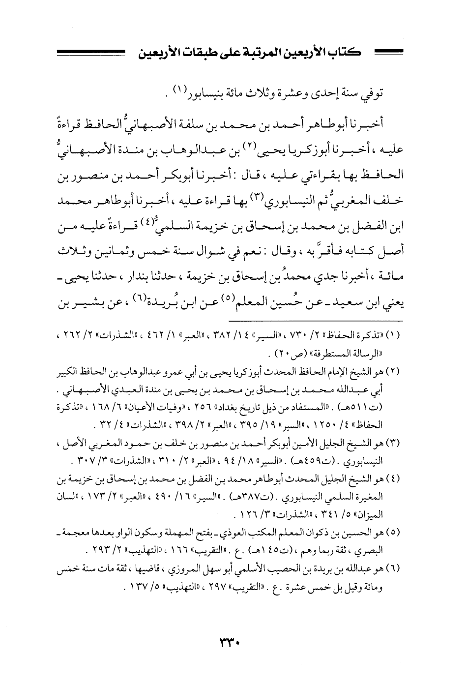 أخبرنا أبو طاهر أحمد بن محمد بن سلفة الأصبهاني الحافظ قراءةً عليه، أخبرنا أبو زكريا يحيى بن عبد الوهاب بن مندة الأصبهاني الحافظ بها بقراءتي عليه، قال: أخبرنا أبو بكر أحمد بن منصور بن خلف المغربي ثم النيسابوري بها قراءة عليه، أخبرنا أبو طاهر محمد ابن الفضل بن محمد بن إسحاق بن خزيمة السلمي قراءةً عليه من أصل كتابه فأقر به، وقال: نعم في شوال سنة خمس وثمانين وثلاث مائة، أخبرنا جدي محمد بن إسحاق بن خزيمة، حدثنا بندار، حدثنا يحيى -يعني ابن سعيد- عن حسين المعلم عن ابن بريدة، عن بشير بن