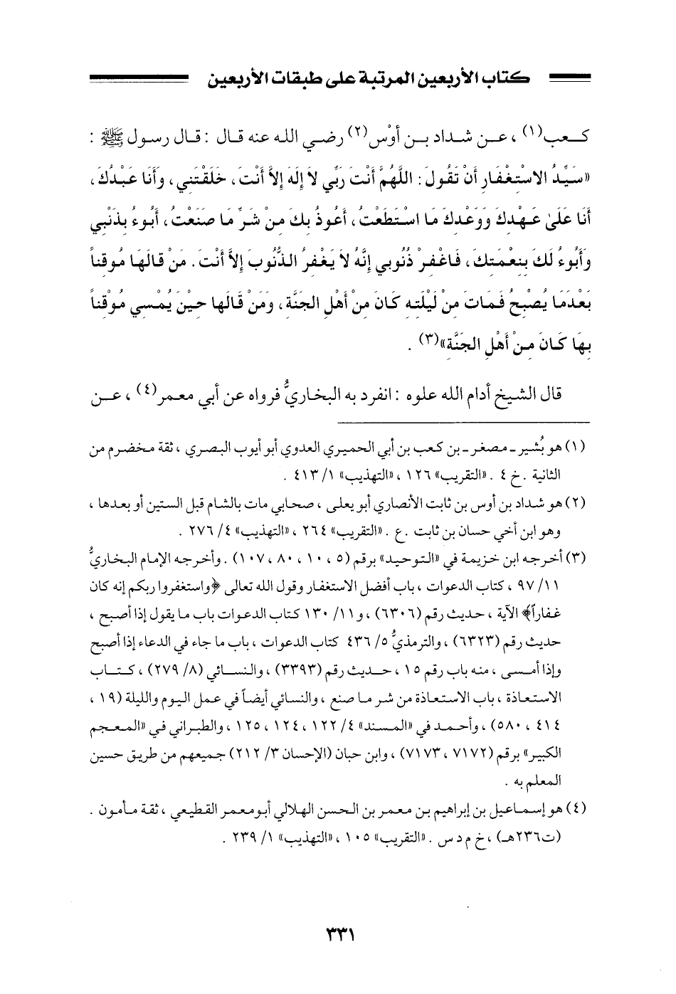 كعب، عن شداد بن أوس رضي الله عنه قال: قال رسول الله صلى الله عليه وسلم: ((سيد الاستغفار أن تقول: اللهم أنت ربي لا إله إلا أنت، خلقتني، وأنا عبدك، أنا على عهدك ووعدك ما استطعت، أعوذ بك من شر ما صنعت، أبوء بذنبي وأبوء لك بنعمتك، فاغفر ذنوبي إنه لا يغفر الذنوب إلا أنت. من قالها موقناً بعدما يصبح فمات من ليلته كان من أهل الجنة، ومن قالها حين يمسي موقناً بها كان من أهل الجنة)) .