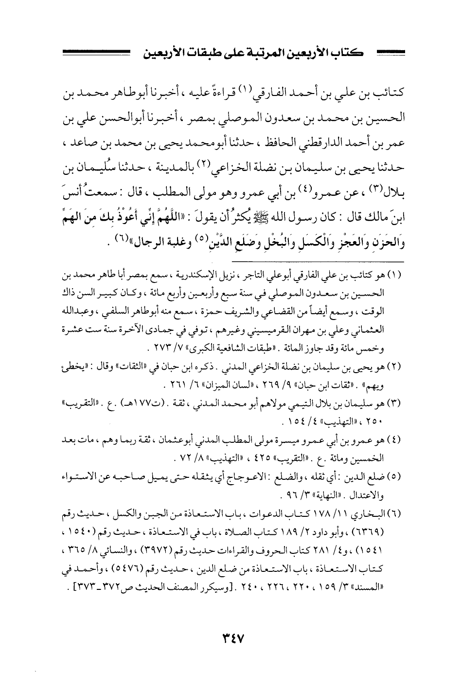 كتائب بن علي بن أحمد الفارقي قراءةً عليه، أخبرنا أبو طاهر محمد بن الحسين بن محمد بن سعدون الموصلي بمصر، أخبرنا أبو الحسن علي بن عمر بن أحمد الدارقطني الحافظ، حدثنا أبو محمد يحيى بن محمد بن صاعد، حدثنا يحيى بن سليمان بن نضلة الخزاعي بالمدينة، حدثنا سليمان بن بلال، عن عمرو بن أبي عمرو وهو مولى المطلب، قال: سمعت أنس ابن مالك قال: كان رسول الله صلى الله عليه وسلم يكثر أن يقول: ((اللهم إني أعوذ بك من الهم والحزن والعجز والكسل والبخل وضلع الدين وغلبة الرجال)) .