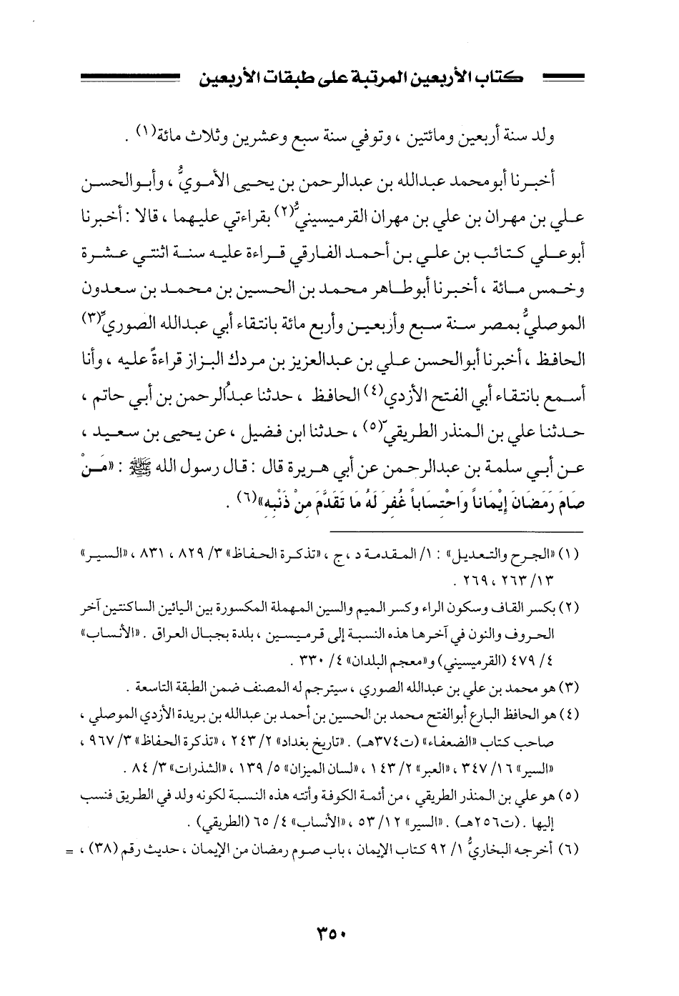 أخبرنا أبو محمد عبد الله بن عبد الرحمن بن يحيى الأموي، وأبو الحسن علي بن مهران بن علي بن مهران القرميسيني بقراءتي عليهما، قالا: أخبرنا أبو علي كتائب بن علي بن أحمد الفارقي قراءة عليه سنة اثنتي عشرة وخمس مائة، أخبرنا أبو طاهر محمد بن الحسن بن محمد بن سعدون الموصلي بمصر سنة سبع وأربعين وأربع مائة بانتقاء أبي عبد الله الصوري الحافظ، أخبرنا أبو الحسن علي بن عبد العزيز بن مردك البزاز قراءةً عليه، وأنا أسمع بانتقاء أبي الفتح الأزدي الحافظ، حدثنا عبد الرحمن بن أبي حاتم، حدثنا علي بن المنذر الطريقي، حدثنا ابن فضيل، عن يحيى بن سعيد، عن أبي سلمة بن عبد الرحمن عن أبي هريرة قال: قال رسول الله صلى الله عليه وسلم: ((من صام رمضان إيماناً واحتساباً غفر له ما تقدم من ذنبه)) .