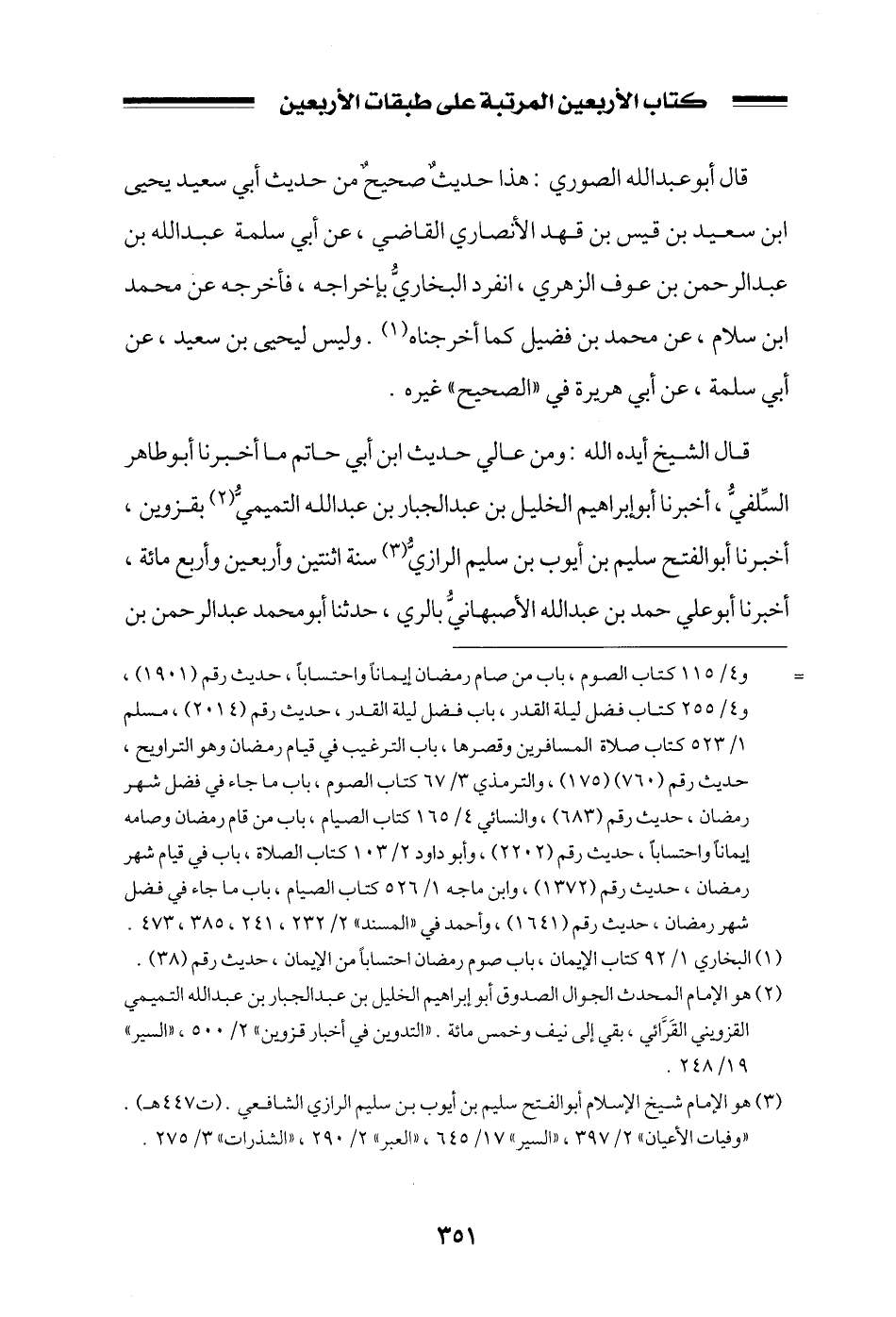 قال أبو عبد الله الصوري: هذا حديثٌ صحيحٌ من حديث أبي سعيد يحيى ابن سعيد بن قيس بن قهد الأنصاري القاضي، عن أبي سلمة عبد الله بن عبد الرحمن بن عوف الزهري، انفرد البخاري بإخراجه، فأخرجه عن محمد ابن سلام، عن محمد بن فضيل كما أخرجناه. وليس ليحيى بن سعيد، عن أبي سلمة، عن أبي هريرة في ((الصحيح)) غيره.