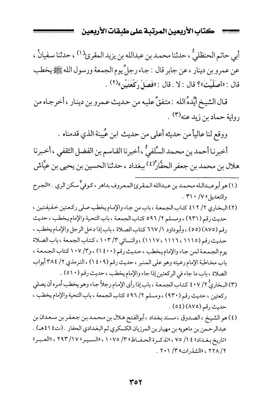 أبي حاتم الحنظلي، حدثنا محمد بن عبد الله بن يزيد المقرئ، حدثنا سفيان، عن عمرو بن دينار، عن جابر قال: جاء رجلٌ يوم الجمعة ورسول الله صلى الله عليه وسلم يخطب قال: ((أصليت)) ؟ قال: لا. قال: ((فصل ركعتين)) .