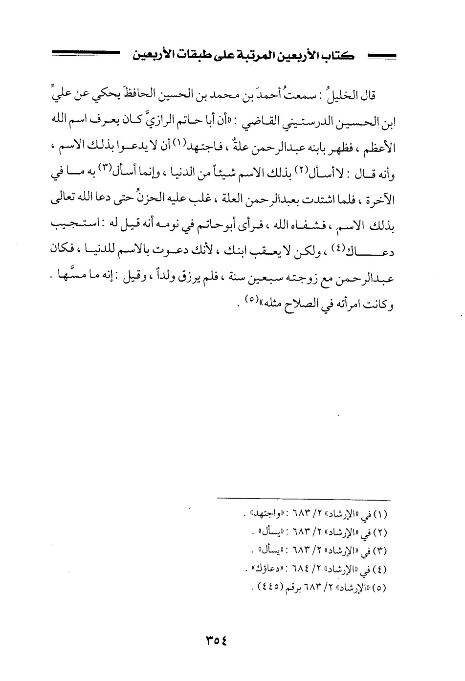 قال الخليل: سمعت أحمد بن محمد بن الحسن الحافظ يحكي عن علي ابن الحسين الدرستيني القاضي: ((أنا أبا حاتم الرازي كان يعرف اسم الله الأعظم، فظهر بابنه عبد الرحمن علةٌ، فاجتهد أن لا يدعوا بذلك الاسم، وأنه قال: لا أسأل بذلك الاسم شيئاً من الدنيا، وإنما أسأل به ما في الآخرة، فلما اشتدت بعبد الرحمن العلة، غلب عليه الحزن حتى دعا الله تعالى بذلك الاسم، فشفاه الله، فرأى أبو حاتم في نومه أنه قيل له: استجيب دعاك، ولكن لا يعقب ابنك، لأنك دعوت بالاسم للدنيا، فكان عبد الرحمن مع زوجته سبعين سنة، فلم يرزق ولداً، وقيل: إنه ما مسها. وكانت امرأته في الصلاح مثله)) .