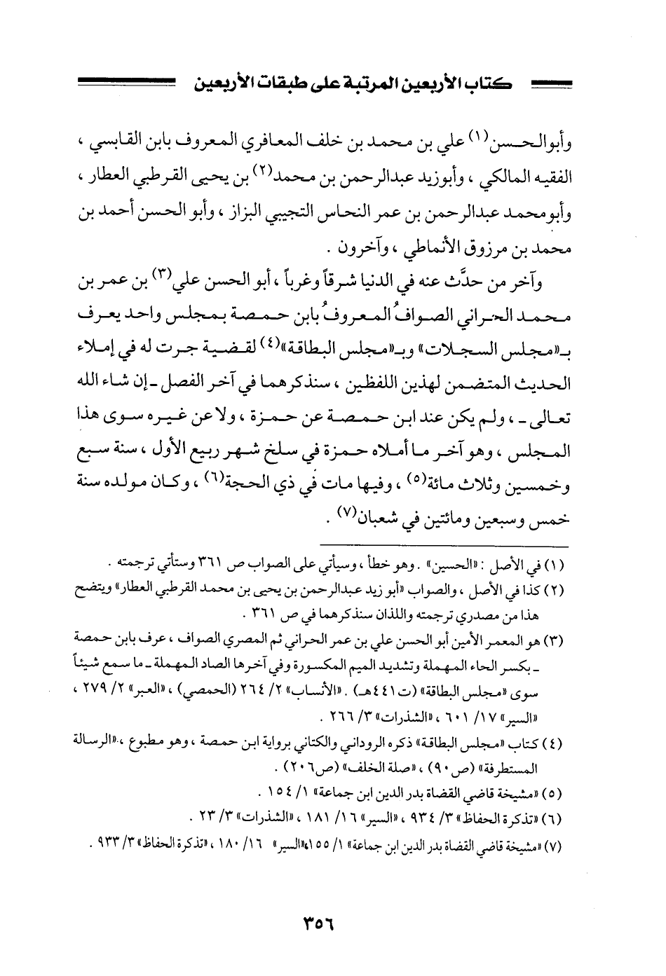 وآخر من حدث عنه في الدنيا شرقاً وغرباً، أبو الحسن علي بن عمر بن محمد الحراني الصواف المعروف بابن حمصة بمجلس واحد يعرف بـ ((مجلس السجلات)) وبـ ((مجلس البطاقة)) لقضية جرت له في إملاء الحديث المتضمن لهذين اللفظين، سنذكرهما في آخر الفصل -إن شاء الله تعالى-، ولم يكن عند ابن حمصة عن حمزة، ولا عن غيره سوى هذا المجلس، وهو آخر ما أملاه حمزة في سلخ شهر ربيع الأول، سنة سبع وخمسين وثلاث مائة، وفيها مات في ذي الحجة، وكان مولده سنة خمس وسبعين ومائتين في شبعان.