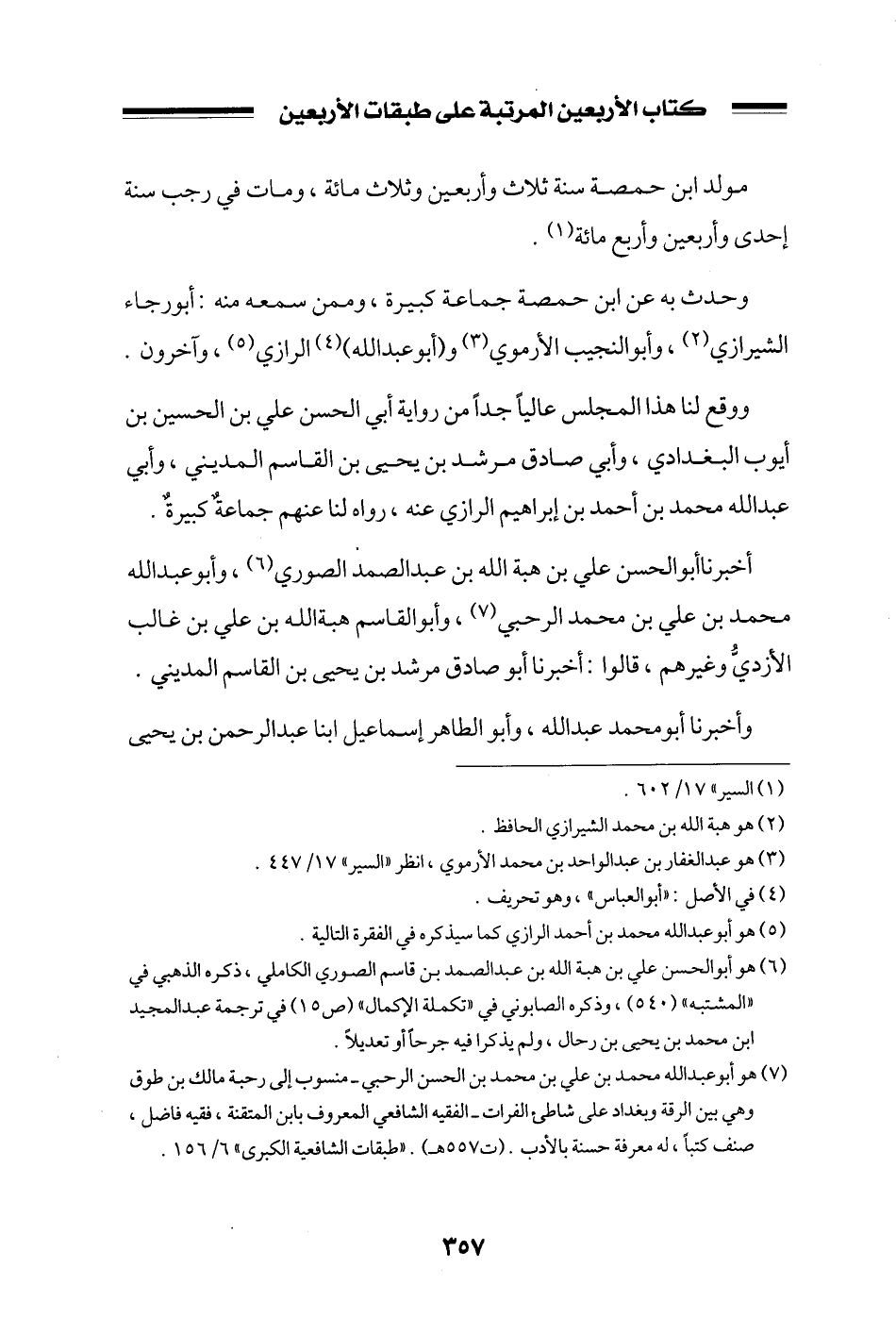أخبرنا أبو الحسن علي بن هبة الله بن عبد الصمد الصوري، وأبو عبد الله محمد بن علي بن محمد الرحبي، وأبو القاسم هبة الله بن علي بن غالب الأزدي وغيرهم، قالوا: أخبرنا أبو صادق مرشد بن يحيى بن القاسم المديني.