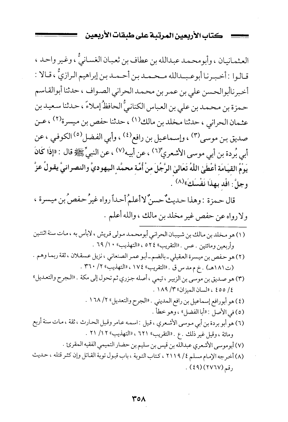 العثمانيان، وأبو محمد عبد الله بن عطاف بن ثعبان الغساني، وغير واحد، قالوا: أخبرنا أبو عبد الله محمد بن أحمد بن إبراهيم الرازي، قالا: أخبرنا أبو الحسن علي بن عمر بن محمد الحراني الصواف، حدثنا أبو القاسم حمزة بن محمد بن علي بن العباس الكناني الحافظ إملاءً، حدثنا سعيد بن عثمان الحراني، حدثنا مخلد بن مالك، حدثنا حفص بن ميسرة، عن صديق بن موسى، وإسماعيل بن رافع، وأبي الفضل الكوفي، عن أبي بردة بن أبي موسى الأشعري، عن أبيه، عن النبي صلى الله عليه وسلم قال: ((إذا كان يوم القيامة أعطى الله تعالى الرجل من أمة محمدٍ اليهودي والنصراني يقول عز وجل: افد بهذا نفسك)) .