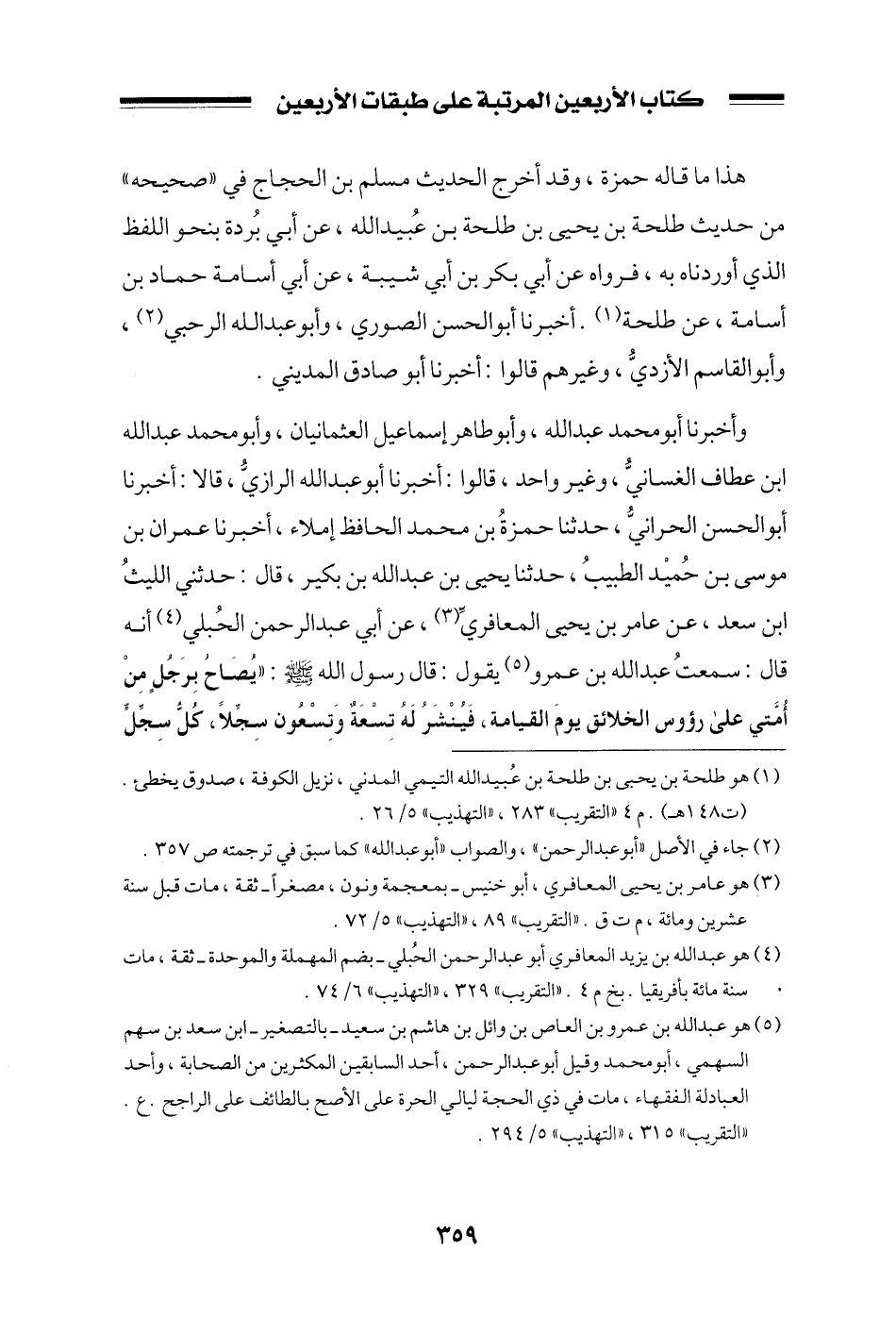 وأخبرنا أبو محمد عبد الله، وأبو طاهر إسماعيل العثمانيان، وأبو محمد عبد الله ابن عطاف الغساني، وغير واحد، قالوا: أخبرنا أبو عبد الله الرازي، قالا: أخبرنا أبو الحسن الحراني، حدثا حمزة بن محمد الحافظ إملاء، أخبرنا عمران بن موسى بن حميد الطبيب، حدثنا يحيى بن عبد الله بن بكير، قال: حدثني الليث ابن سعد، عن عامر بن يحيى المعافري، عن أبي عبد الرحمن الحبلي أنه قال: سمعت عبد الله بن عمرو يقول: قال رسول الله صلى الله عليه وسلم: ((يصاح برجلٍ من أمتي على رؤوس الخلائق يوم القيامة، فينشر له تسعةٌ وتسعون سجلاً، كل سجل