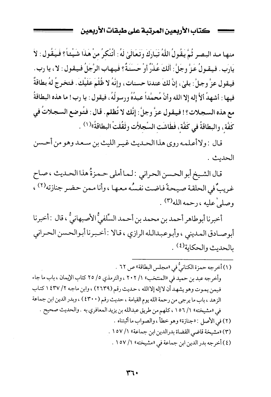 منها مد البصر ثم يقول الله تبارك وتعالى له: أتنكر من هذا شيئاً؟ فيقول: لا يا رب. فيقول عز وجل: ألك عذرٌ أو حسنةٌ؟ فيهاب الرجل فيقول: لا، يا رب، فيقول عز وجل: بلى، إن لك عندنا حسنات، وإنه لا ظلم عليك. فتخرج له بطاقةً فيها: أشهد أن لا إله إلا الله وأن محمداً عبده ورسوله، فيقول: يا رب! ما هذه البطاقة مع هذه السجلات؟! فيقول عز وجل: إنك لا تظلم. قال: فتوضع السجلات في كفة، والبطاقة في كفةٍ، فطاشت السجلات وثقلت البطاقة)) .