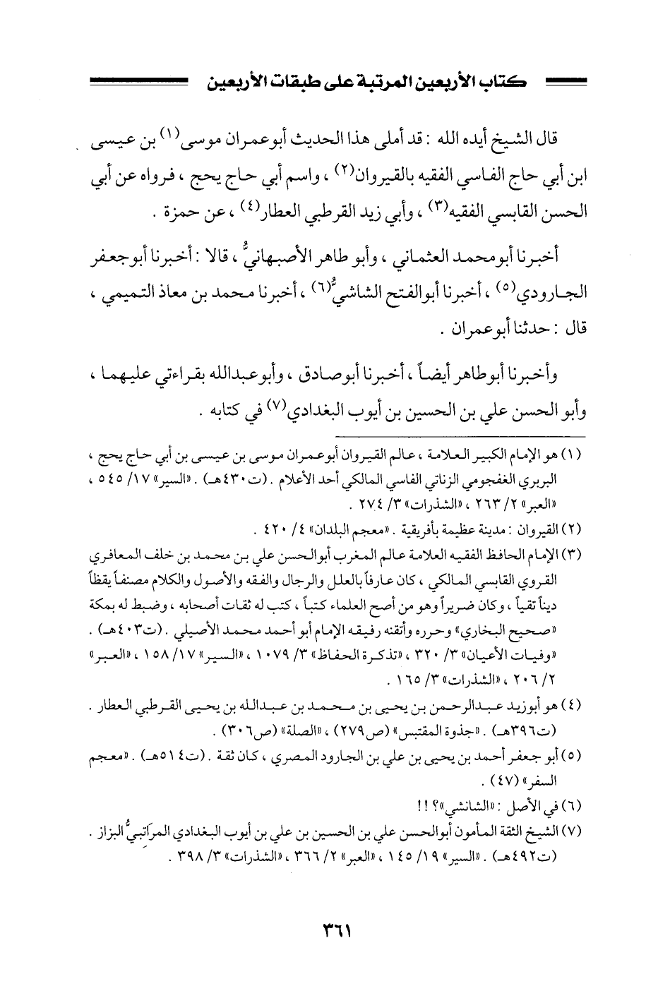 أخبرنا أبو محمد العثماني، وأبو طاهر الأصبهاني، قالا: أخبرنا أبو جعفر الجارودي، أخبرنا أبو الفتح الشاشي، أخبرنا محمد بن معاذ التميمي، قال: حدثنا أبو عمران.