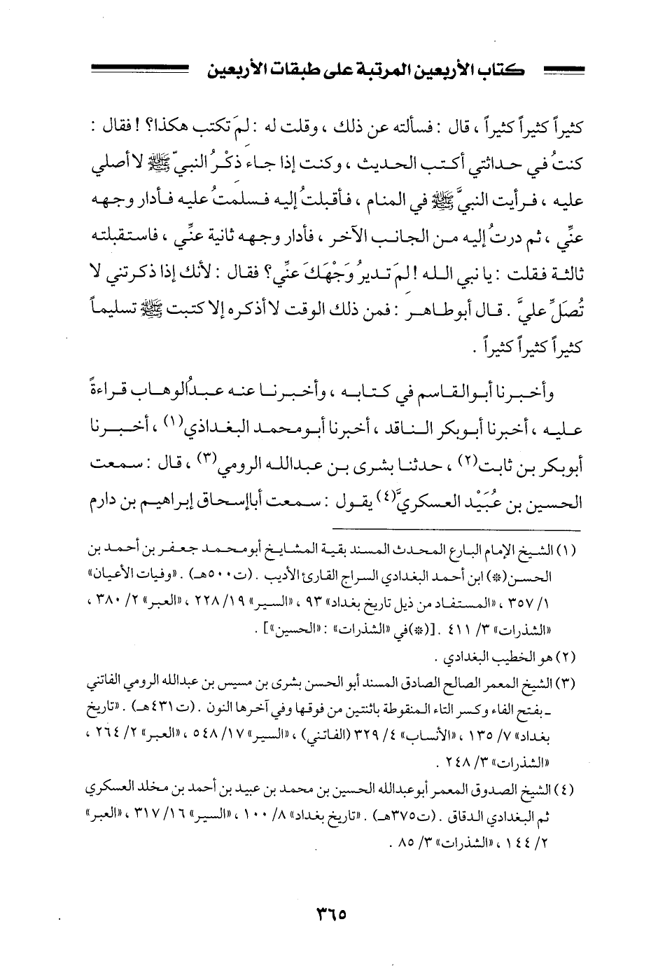 كثيراً كثيراً كثيراً، قال: فسألته عن ذلك، وقلت له: لم تكتب هكذا؟! فقال: كنت في حداثتي أكتب الحديث، وكنت إذا جاء ذكر النبي صلى الله عليه وسلم لا أصلي عليه، فرأيت النبي صلى الله عليه وسلم في المنام، فأقبلت إليه فسلمت عليه فأدار وجهه عني، ثم درت إليه من الجانب الآخر، فأدار وجهه ثانية عني، فاستقبلته ثالثة فقلت: يا نبي الله! لم تدير وجهك عني؟ فقال: لأنك إذا ذكرتني لا تصل علي. قال أبو طاهر: فمن ذلك الوقت لا أذكره إلا كتبت صلى الله عليه وسلم تسليماً كثيراً كثيراً كثيراً.