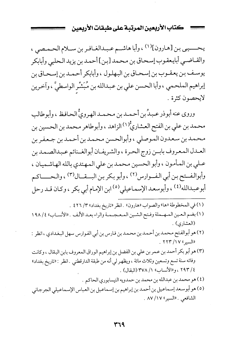 يحيى بن [هارون] ، وأبا هاشم عبد الغافر بن سلام الحمصي، والقاضي أبا يعقوب إسحاق بن محمد [بن] أحمد بن يزيد الحلبي وأبا بكر يوسف بن يعقوب بن إسحاق بن البهلول، وأبا بكر أحمد بن إسحاق بن إبراهيم الملحمي، وأبا الحسن علي بن عبد الله بن مبشرٍ الواسطي، وآخرين لا يحصون كثرة.