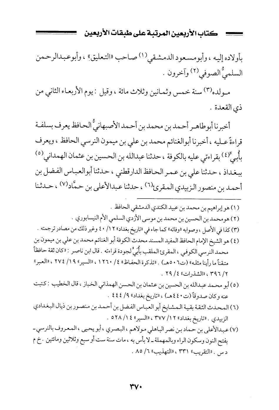 أخبرنا أبو طاهر أحمد بن محمد بن أحمد الأصبهاني الحافظ يعرف بسلفة قراءةً عليه، أخبرنا أبو الغنائم محمد بن علي بن ميمون النرسي الحافظ، ويعرف بأبي بقراءتي عليه بالكوفة، حدثنا عبد الله بن الحسين بن عثمان الهمداني ببغداذ، حدثنا علي بن عمر الحافظ الدارقطني، حدثنا أبو العباس الفضل بن أحمد بن منصور الزبيدي المقرئ، حدثنا عبد الأعلى بن حماد، حدثنا
