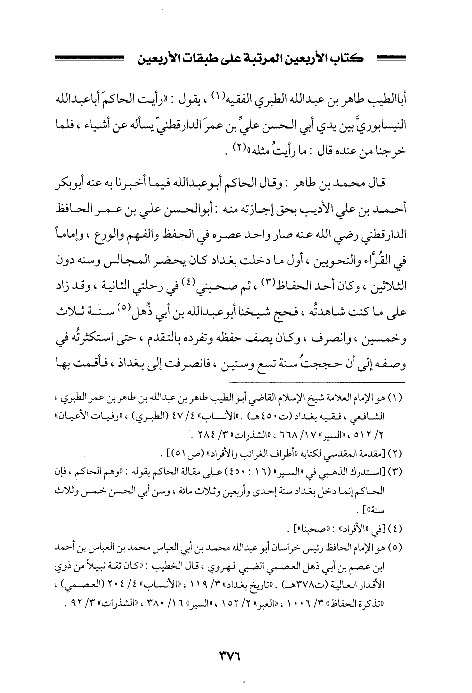 أبا الطيب طاهر بن عبد الله الطبري الفقيه، يقول: ((رأيت الحاكم أبا عبد الله النيسابوري بين يدي أبي الحسن علي بن عمر الدارقطني يسأله عن أشياء، فلما خرجنا من عنده قال: ما رأيت مثله)) .