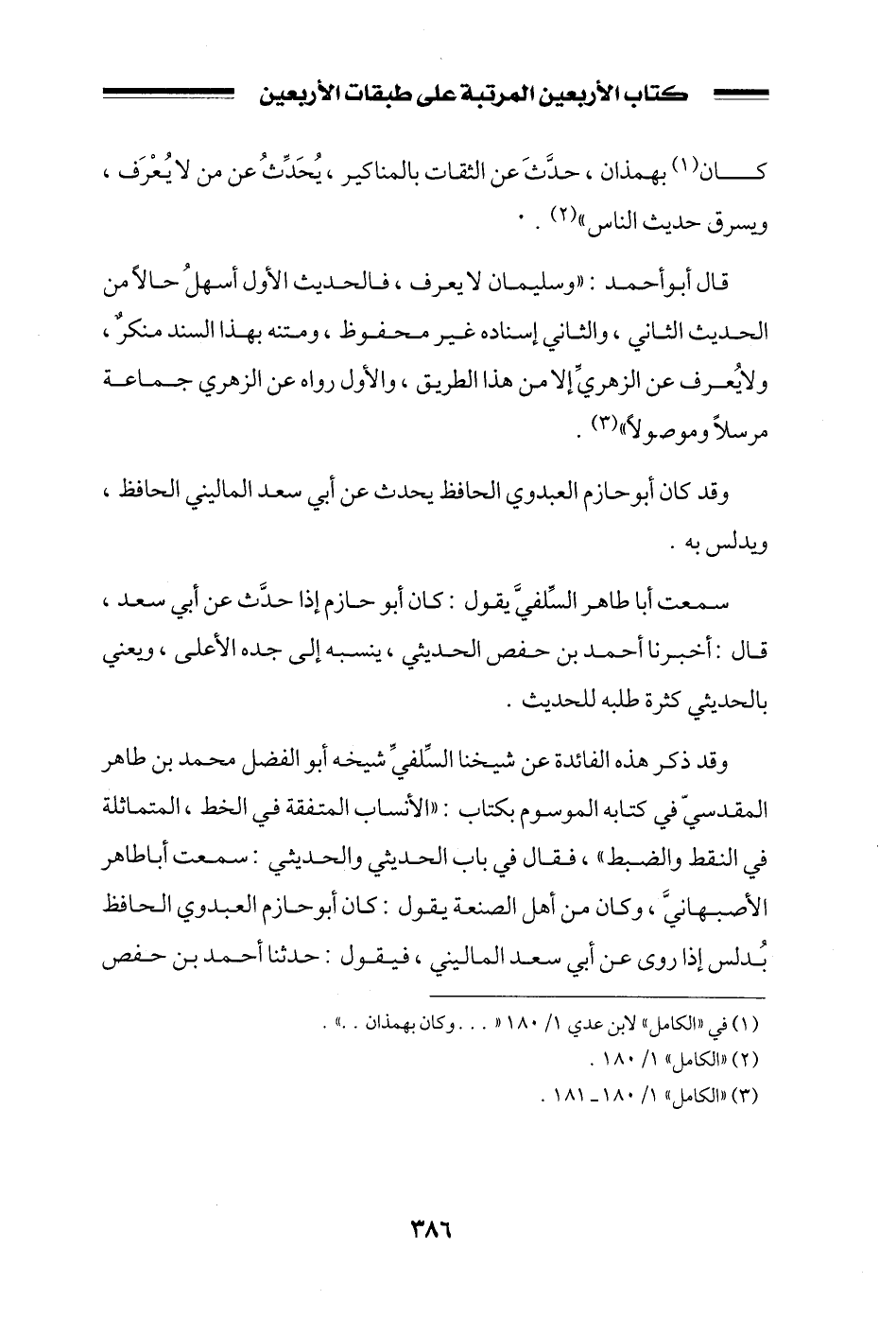 وقد ذكر هذه الفائدة عن شيخنا السلفي شيخه أبو الفضل محمد بن طاهر المقدسي في كتابه الموسوم بكتاب: ((الأنساب المتفقه في الخط، المتماثلة في النقط والضبط)) ، فقال في باب الحديثي والحديثي: سمعت أبا طاهر الأصبهاني، وكان من أهل الصنعة يقول: كان أبو حازم العبدوي الحافظ يدلس إذا روى عن أبي سعد الماليني، فيقول: حدثنا أحمد بن حفص