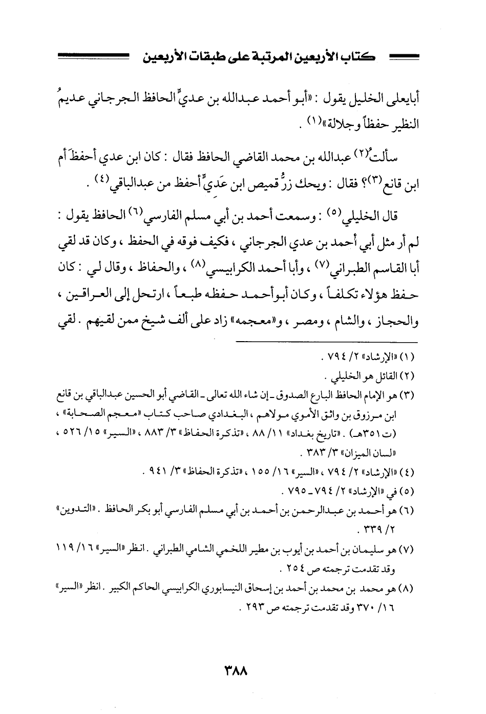 أبا يعلى الخليل يقول: ((أبو أحمد عبد الله بن عدي الحافظ الجرجاني عديم النظير حفظاً وجلالة)) .