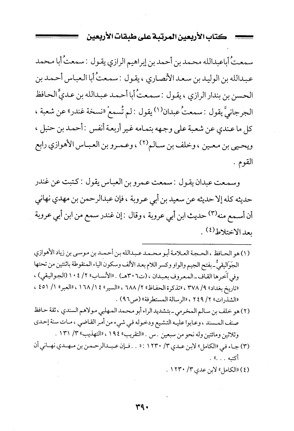 سمعت أبا عبد الله محمد بن أحمد بن إبراهيم الرازي يقول: سمعت أبا محمد عبد الله بن الوليد بن سعد الأنصاري، يقول: سمعت أبا العباس أحمد بن الحسن بن بندار الرازي، يقول: سمعت أبا أحمد عبد الله بن عدي الحافظ الجرجاني يقول: سمعت عبدان يقول: لم تسمع ((نسخة غندر)) عن شعبة، كل ما عندي عن شعبة على وجهه بتمامه غير أربعة أنفس: أحمد بن حنبل، ويحيى بن معين، وخلف بن سالم، وعمرو بن العباس الأهوازي رابع القوم.