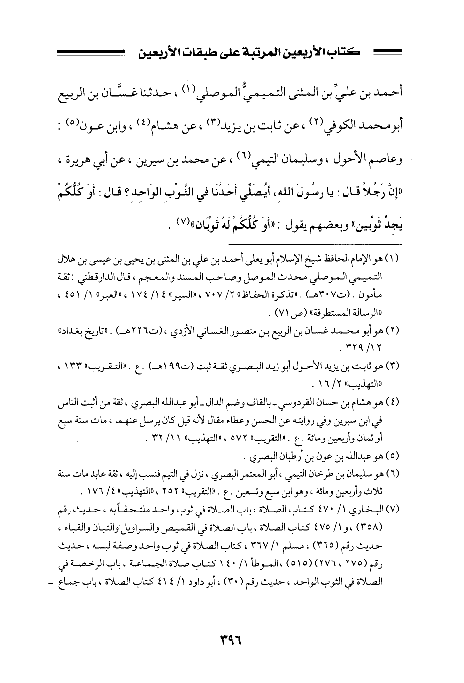 أحمد بن علي بن المثنى التميمي الموصلي، حدثنا غسان بن الربيع أبو محمد الكوفي، عن ثابت بن يزيد، عن هشام، وابن عون: وعاصم الأحول، وسليمان التيمي، عن محمد بن سيرين، عن أبي هريرة، ((إن رجلاً قال: يا رسول الله، أيصلي أحدنا في الثوب الواحد؟ قال: أو كلكم يجد ثوبين)) وبعضهم يقول: ((أو كلكم له ثوبان)) .