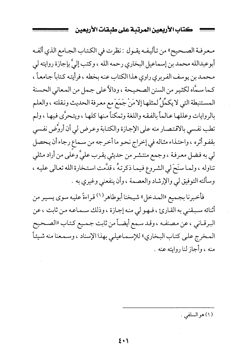 فأخبرنا بجميع ((المدخل)) شيخنا أبو طاهر قراءةً عليه سوى يسير من أثنائه سبقني به القارئ، فهو لي منه إجازة، وذلك سماعه من ثابت، عن البرقاني، عن مصنفه، وقد سمع أيضاً من ثابت جميع كتاب ((الصحيح المخرج على كتاب البخاري)) للإسماعيلي بهذا الإسناد، وسمعنا منه شيئاً منه، وأجاز لنا روايته عنه.