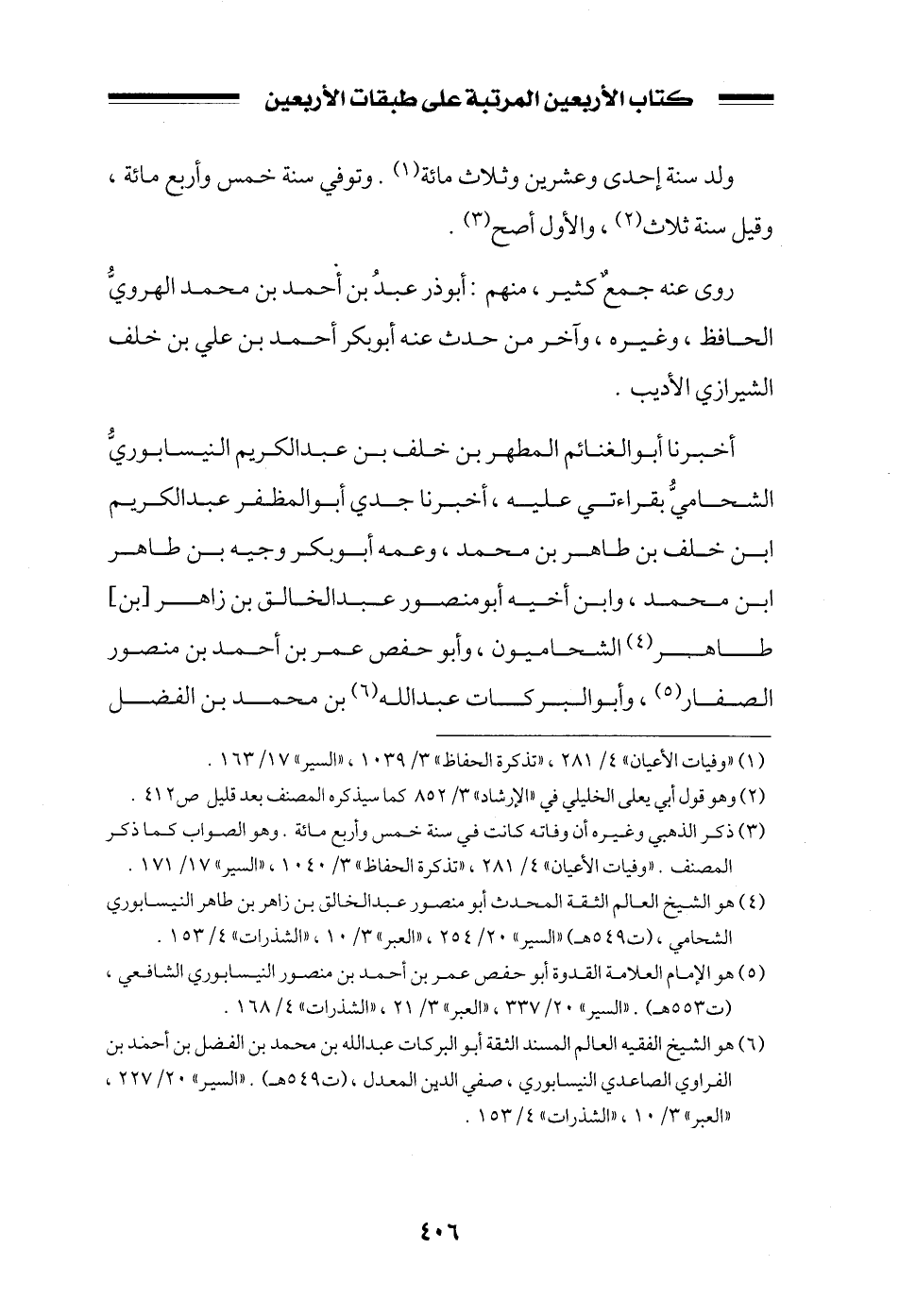 أخبرنا أبو الغنائم المطهر بن خلف بن عبد الكريم النيسابوري الشحامي بقراءتي عليه، أخبرنا جدي أبو المظفر عبد الكريم ابن خلف بن طاهر بن محمد، وعمه أبو بكر وجيه بن طاهر ابن محمد، وابن أخيه أبو منصور عبد الخالق بن زاهر [بن] طاهر الشحاميون، وأبو حفص عمر بن أحمد بن منصور الصفار، وأبو البركات عبد الله بن محمد بن الفضل