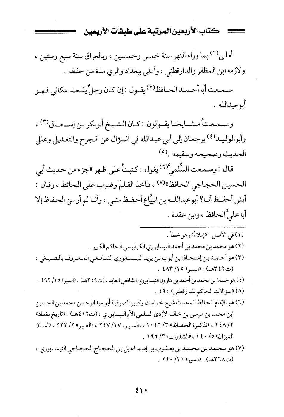 قال: وسمعت السلمي يقول: كتبت على ظهر ((جزء من حديث أبي الحسين الحجاجي الحافظ)) ، فأخذ القلم وضرب على الحائط، وقال: أيش أحفظ أنا؟ أبو عبد الله بن البياع أحفظ مني، وأنا لم أر من الحفاظ إلا أبا علي الحافظ، وابن عقدة.