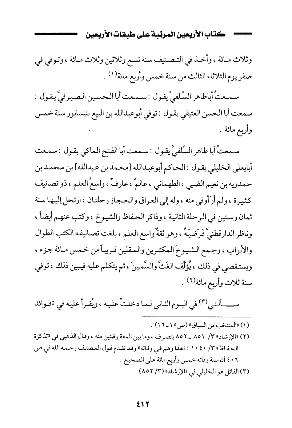سمعت أبا طاهر السلفي يقول: سمعت أبا الفتح الماكي يقول: سمعت أبا يعلى الخليلي يقول: الحاكم أبو عبد الله [محمد بن عبد الله] بن محمد بن حمدويه بن نعيم الضبي، الطهماني، عالمٌ، عارفٌ، واسع العلم، ذو تصانيف كثيرة، ولم أر أوفى منه، ولد إلى العراق والحجاز رحلتان، ارتحل إليها سنة ثمان وستين في الرحلة الثانية، وذاكر الحفاظ والشيوخ، وكتب عنهم أيضاً، وناظر الدارقطني فرضيه، وهو ثقةٌ واسع العلم، بلغت تصانيفه الكتب الطوال والأبواب، وجمع الشيوخ المكثرين والمقلين قريباً من خمس مائة جزء، ويستقصي في ذلك، يؤلف الغث والسمين، ثم يتكلم عليه فيبين ذلك، توفي سنة ثلاث وأربع مائة.