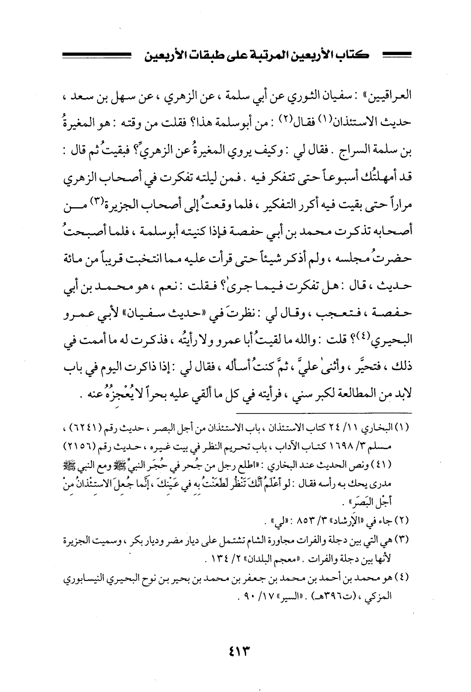 العراقيين)) : سفيان الثوري عن أبي سلمة، عن الزهري، عن سهل بن سعد، حديث الاستئذان فقال: من أبو سلمة هذا؟ فقلت من وقته: هو المغيرة بن سلمة السراج. فقال لي: وكيف يروي المغيرة عن الزهري؟ فبقيت ثم قال: قد أمهلتك أسبوعاً حتى تتفكر فيه. فمن ليلته تفكرت في أصحاب الزهري مراراً حتى بقيت فيه أكرر التفكير، فلما وقعت إلى أصحاب الجزيرة من أصحابه تذكرت محمد بن أبي حفصة فإذا كنيته أبو سلمة، فلما أصبحت حضرت مجلسه، ولم أذكر شيئاً حتى قرأت عليه مما انتخبت قريباً من مائة حديث، قال: هل تفكرت فيما جرى؟ فقلت: نعم، هو محمد بن أبي حفصة، فتعجب، وقال لي: نظرت في ((حديث سفيان)) لأبي عمرو البحيري؟ قلت: والله ما لقيت أبا عمرو ولا رأيته، فذكرت له ما أممت في ذلك، فتحير، وأثنى علي، ثم كنت أسأله، فقال لي: إذا ذاكرت اليوم في باب لابد من المطالعة لكبر سني، فرأيته في كل ما ألقي عليه بحراً لا يعجزه عنه.