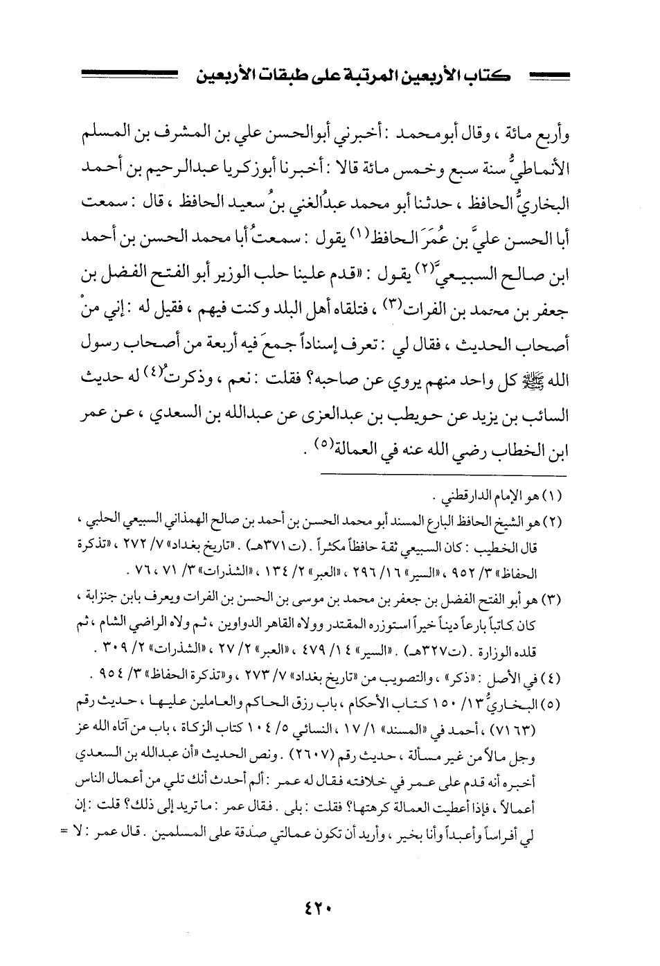 وأربع مائة، وقال أبو محمد: أخبرني أبو الحسن علي بن المشرف بن المسلم الأنماطي سنة سبع وخمس مائة قالا: أخبرنا أبو زكريا عبد الرحيم بن أحمد البخاري الحافظ، حدثنا أبو محمد عبد الغني بن سعيد الحافظ، قال: سمعت أبا الحسن علي بن عمر الحافظ يقول: سمعت أبا محمد الحسن بن أحمد ابن صالح السبيعي يقول: ((قدم علينا حلب الوزير أبو الفتح الفضل بن جعفر بن محمد بن الفرات، فتلقاه أهل البلد وكنت فيهم، فقيل له: إني من أصحاب الحديث، فقال لي: تعرف إسناداً جمع فيه أربعة من أصحاب رسول الله صلى الله عليه وسلم كل واحد منهم يروي عن صاحبه؟ فقلت: نعم، وذكرت له حديث السائب بن يزيد عن حويطب بن عبد العزى عن عبد الله بن السعدي، عن عمر ابن الخطاب رضي الله عنه في العمالة.