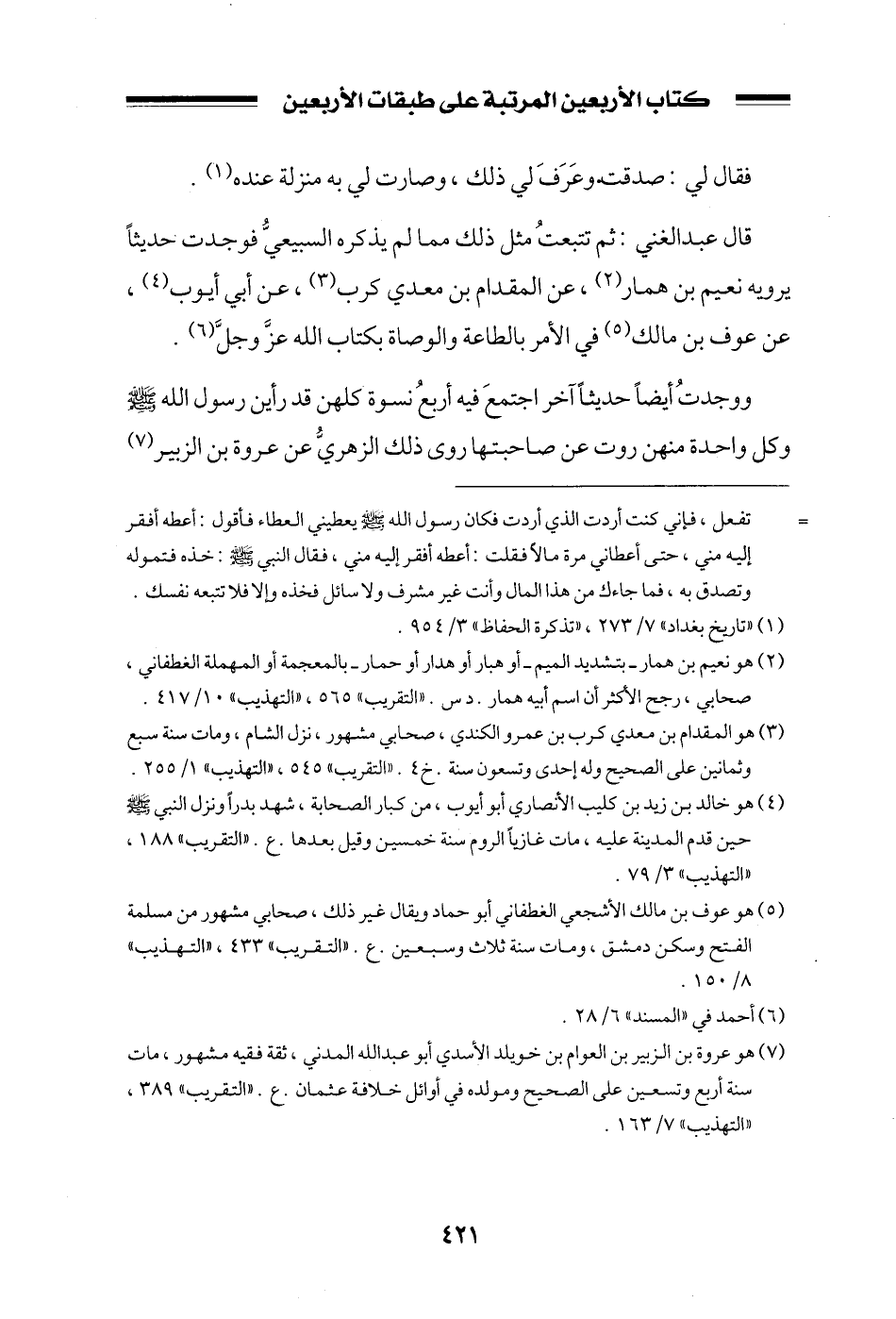 قال عبد الغني: ثم تتبعت مثل ذلك مما لم يذكره السبيعي فوجدت حديثاً يرويه نعيم بن همار، عن المقدام بن معدي كرب، عن أبي أيوب، عن عوف بن مالك في الأمر بالطاعة والوصاة بكتاب الله عز وجل.