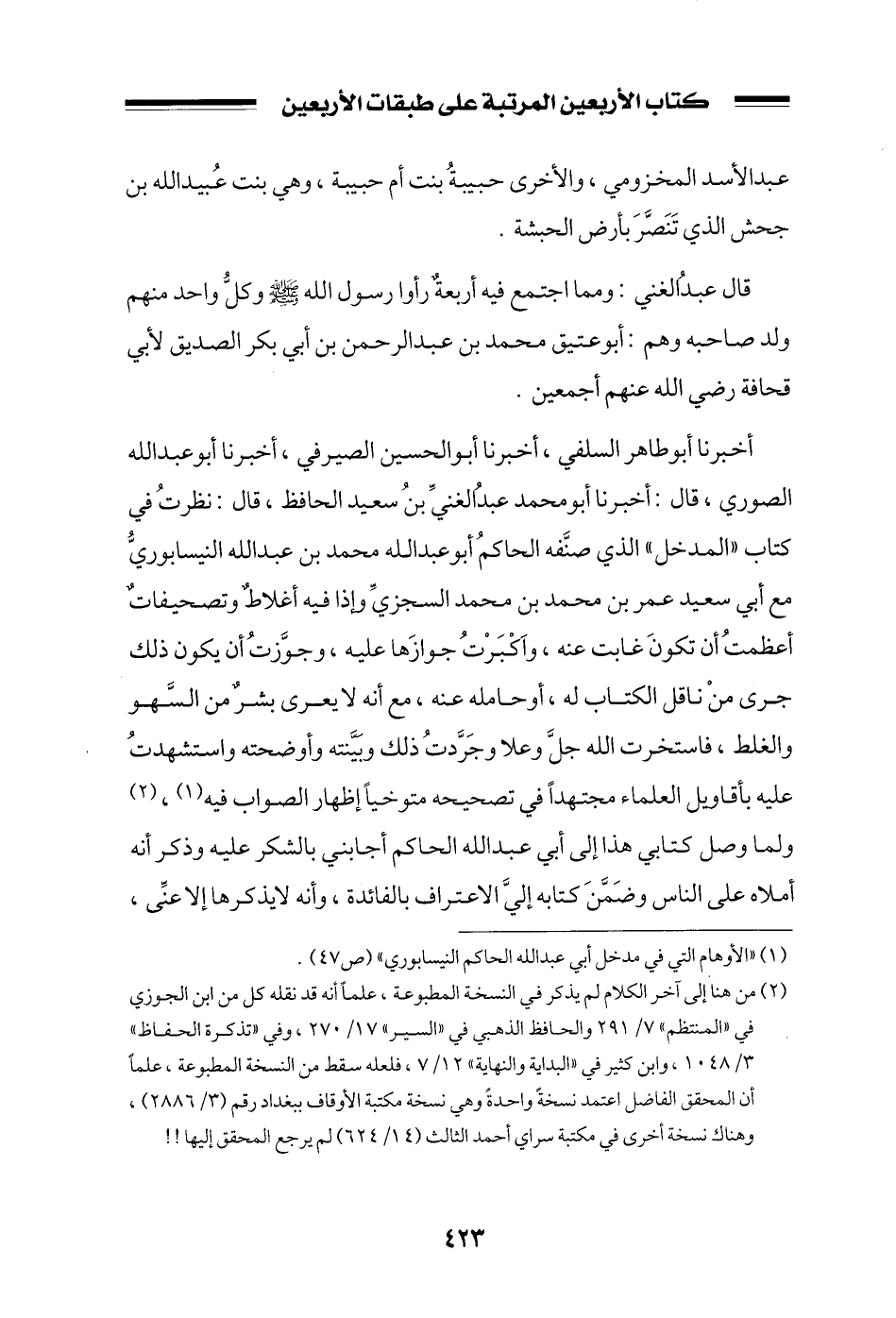 أخبرنا أبو طاهر السلفي، أخبرنا أبو الحسين الصيرفي، أخبرنا أبو عبد الله الصوري، قال: أخبرنا أبو محمد عبد الغني بن سعيد الحافظ، قال: نظرت في كتاب ((المدخل)) الذي صنفه الحاكم أبو عبد الله محمد بن عبد الله النيسابوري مع أبي سعيد عمر بن محمد بن محمد السجزي وإذا فيه أغلاطٌ وتصحيفاتٌ أعظمت أن تكون غابت عنه، وأكبرت جوازها عليه، وجوزت أن يكون ذلك جرى من ناقل الكتاب له، أو حامله عنه، مع أنه لا يعرى بشرٌ من السهو والغلط، فاستخرت الله جل وعلا وجردت ذلك وبينته وأوضحته واستشهدت عليه بأقاويل العلماء مجتهداً في تصحيحه متوخياً إظهار الصواب فيه، ولما وصل كتابي هذا إلى أبي عبد الله الحاكم أجابني بالشكر عليه وذكر أنه أملاه على الناس وضمن كتابه إلي الاعتراف بالفائدة، وأنه لا يذكرها إلا عنى،