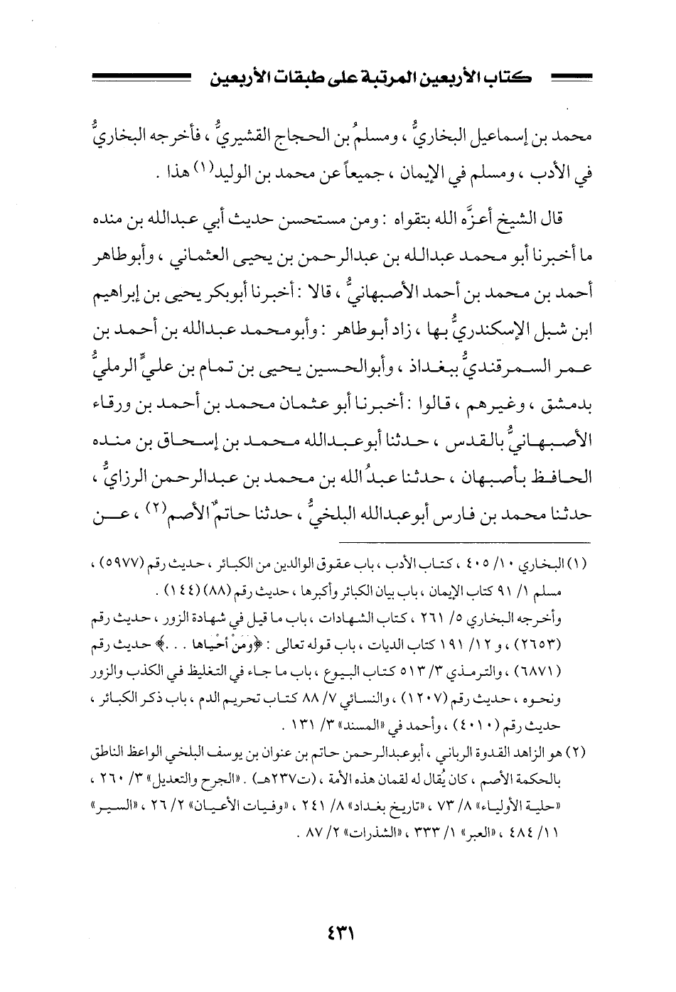 قال الشيخ أعزه الله بتقواه: ومن مستحسن حديث أبي عبد الله بن منده ما أخبرنا أبو محمد عبد الله بن عبد الرحمن بن يحيى العثماني، وأبو طاهر أحمد بن محمد بن أحمد الأصبهاني، قالا: أخبرنا أبو بكر يحيى بن إبراهيم ابن شبل الإسكندري بها، زاد أبو طاهر: وأبو محمد عبد الله بن أحمد بن عمر السمرقندي ببغداذ، وأبو الحسين يحيى بن تمام بن علي الرملي بدمشق، وغيرهم، قالوا: أخبرنا أبو عثمان محمد بن أحمد بن ورقاء الأصبهاني بالقدس، حدثنا أبو عبد الله محمد بن إسحاق بن منده الحافظ بأصبهان، حدثنا عبد الله بن محمد بن عبد الرحمن الرازي، حدثنا محمد بن فارس أبو عبد الله البلخي، حدثنا حاتمٌ الأصم، عن