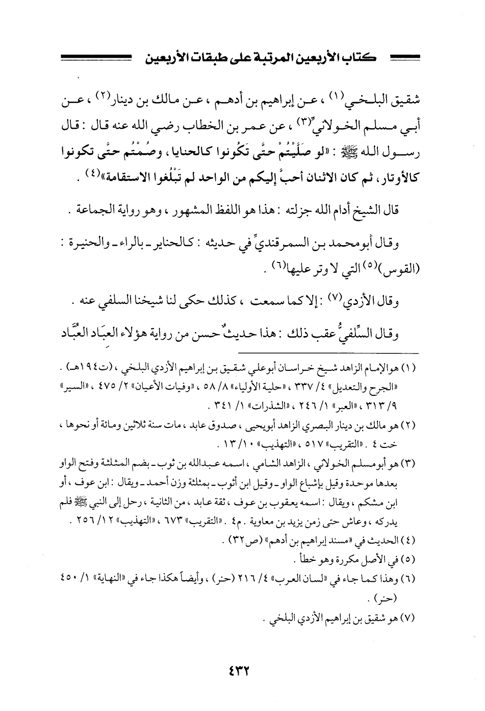 شقيق البلخي، عن إبراهيم بن أدهم، عن مالك بن دينار، عن أبي مسلم الخولاني، عن عمر بن الخطاب رضي الله عنه قال: قال رسول الله صلى الله عليه وسلم: ((لو صليتم حتى تكونوا كالحنايا، وصمتم حتى تكونوا كالأوتار، ثم كان الاثنان أحب إليكم من الواحد لم تبلغوا الاستقامة)) .