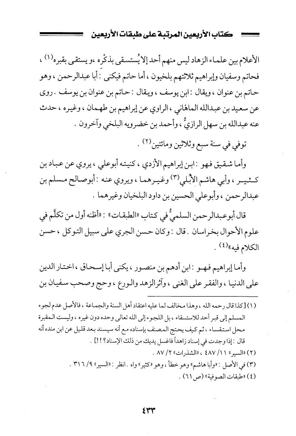 وأما إبراهيم فهو: ابن أدهم بن منصور، يكنى أبا إسحاق، اختار الدين على الدنيا، والفقر على الغنى، وآثر الزهد والورع، وحج وصحب سفيان بن
