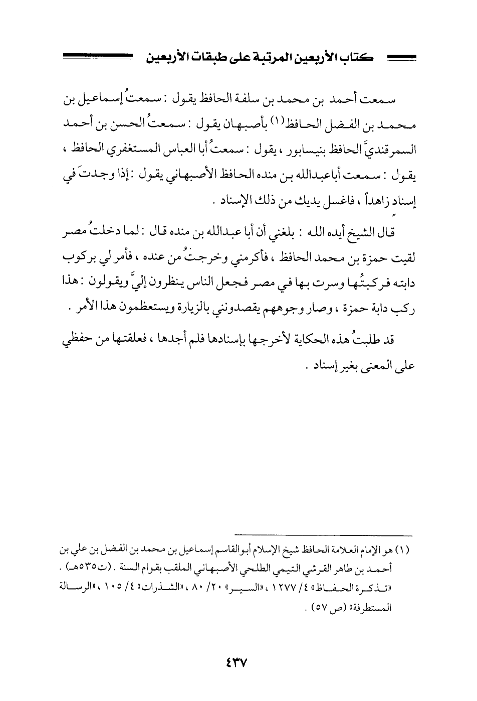 قال الشيخ أيده الله: بلغني أن أبا عبد الله بن منده قال: لما دخلت مصر لقيت حمزة بن محمد الحافظ، فأكرمني وخرجت من عنده، فأمر لي بركوب دابته فركبتها وسرت بها في مصر فجعل الناس ينظرون إلي ويقولون: هذا ركب دابة حمزة، وصار وجوههم يقصدونني بالزيارة ويستعظمون هذا الأمر.