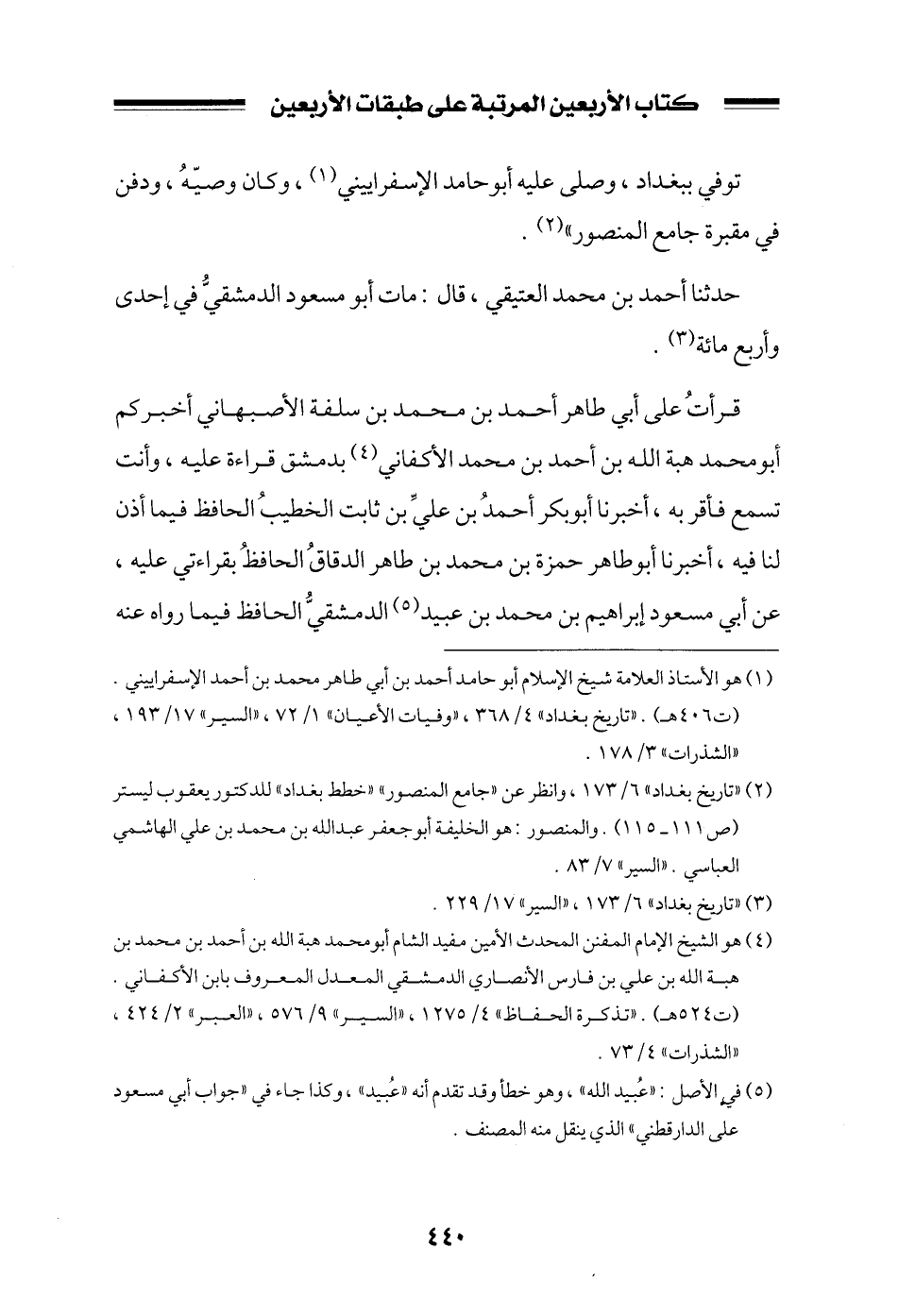 قرأت على أبي طاهر أحمد بن محمد بن سلفة الأصبهاني أخبركم أبو محمد هبة الله بن أحمد بن محمد الأكفاني بدمشق قراءةً عليه، وأنت تسمع فأقر به أخبرنا أبو بكر أحمد بن علي بن ثابت الخطيب الحافظ فيما أذن لنا فيه، أخبرنا أبو طاهر حمزة بن محمد بن طاهر الدقاق الحافظ بقراءتي عليه، عن أبي مسعود إبراهيم بن محمد بن عبيد الدمشقي الحافظ فيما رواه عنه