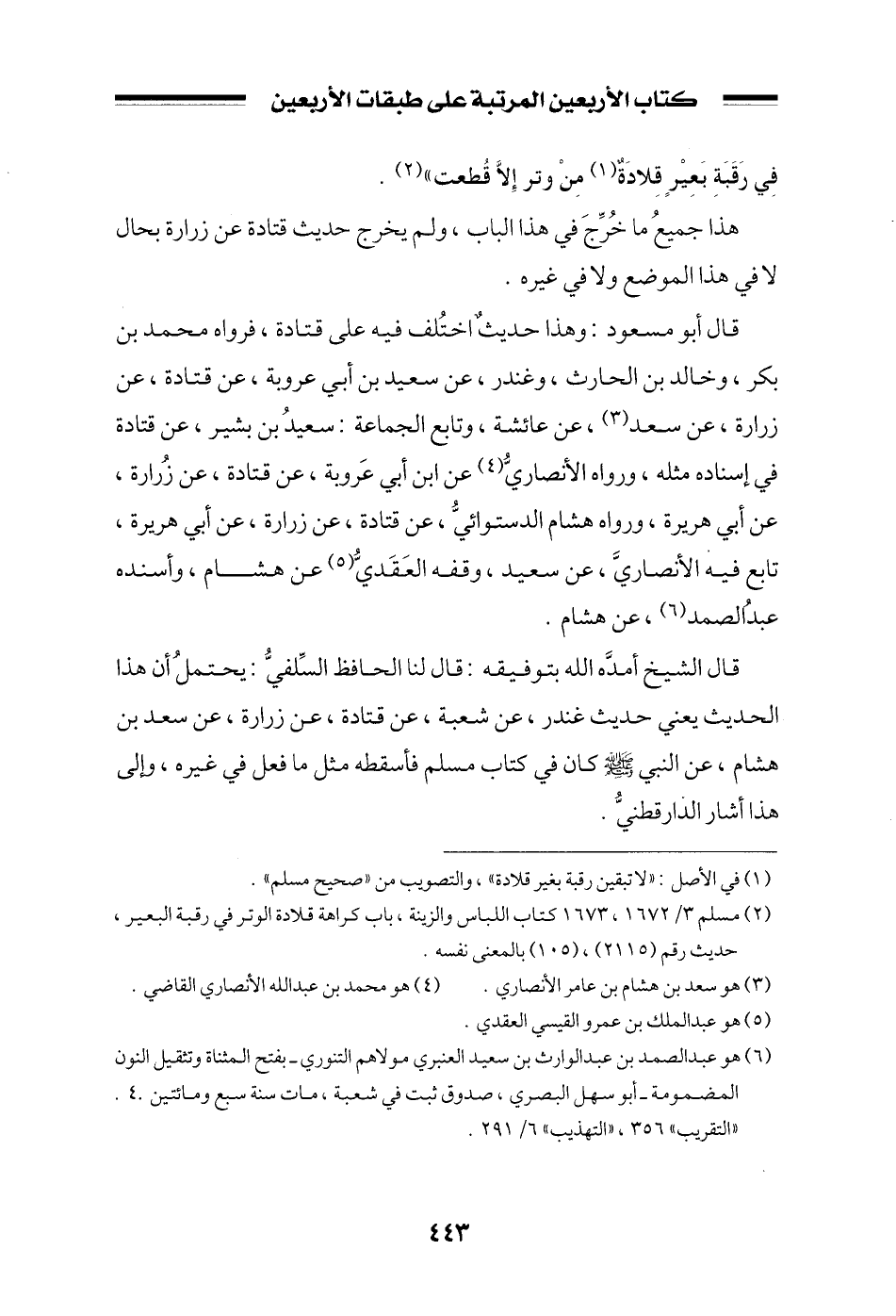 قال الشيخ أمده الله بتوفيقه: قال لنا الحافظ السلفي، يحتمل أن هذا الحديث يعني حديث غندر، عن شعبة، عن قتادة، عن زرارة، عن سعد بن هشام، عن النبي صلى الله عليه وسلم كان في كتاب مسلم فأسقطه مثل ما فعل في غيره، وإلى هذا أشار الدارقطني.