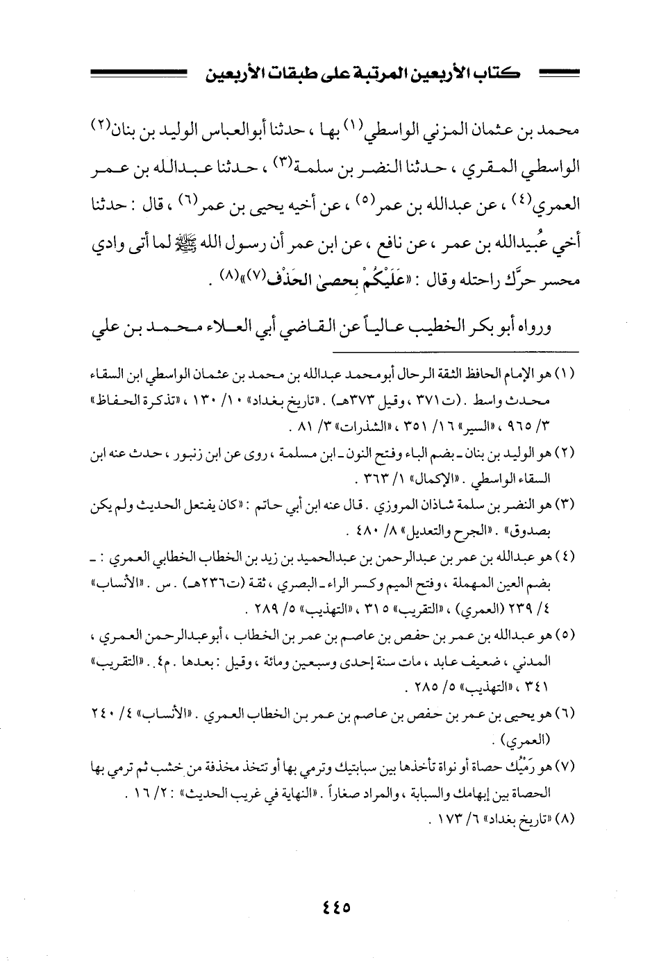 محمد بن عثمان المزني الواسطي بها، حدثنا أبو العباس الوليد بن بنان الواسطي المقري، حدثنا النضر بن سلمة، حدثنا عبد الله بن عمر العمري، عن عبد الله بن عمر، عن أخيه يحيى بن عمر، قال: حدثنا أخي عبيد الله بن عمر، عن نافع، عن ابن عمر أن رسول الله صلى الله عليه وسلم لما أتى وادي محسر حرك راحلته وقال: ((عليكم بحصى الحذف)) .